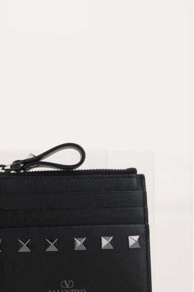 Valentino Garavani's credit card holder crafted in black smooth leather adorned with signature ruthenium-tone metal studs. It features zip coin pockey and and six card slots. Fabric-lined interior. The design is completed by the unmistakable embossed logo on front.