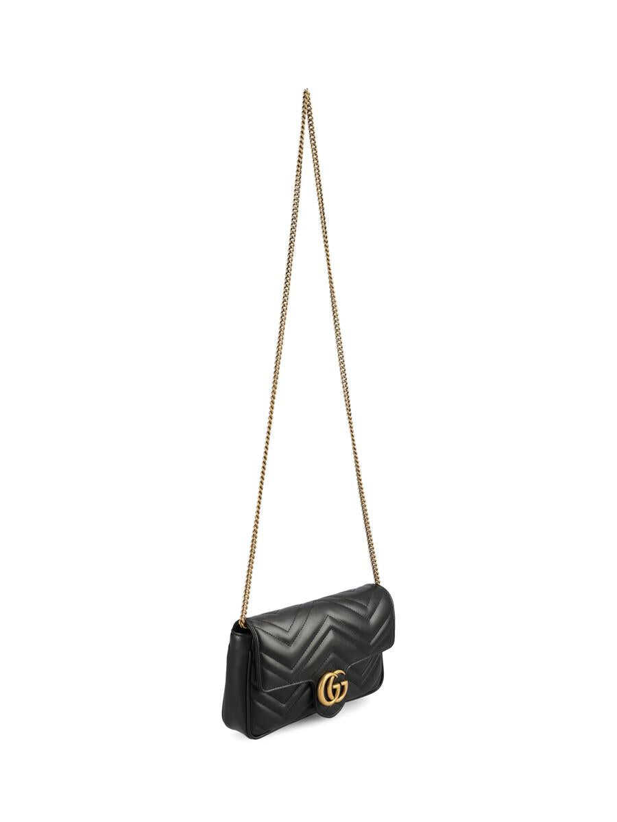 - Material: 100% calfskin leather - Color: black - Interior: 2 card slots, detachable card holder with zipper closure - Other details: white leather card holder and GG logo applied on front - Sliding chain shoulder strap - Snap button closure - Made in Italy - Dust bag - Item code: 751526AACCE1061 - Dimensions: W 21 cm x H 12 cm x D 5 cm