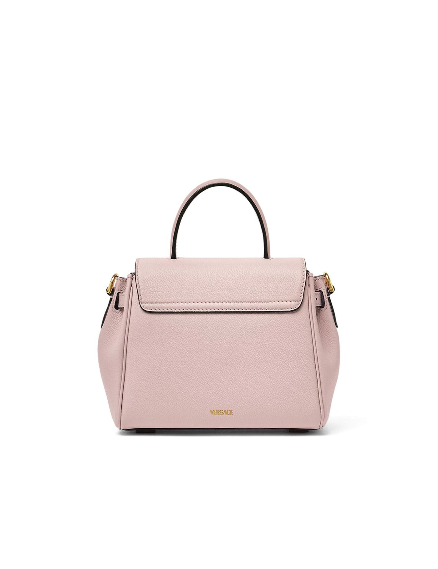 Small La Medusa handbag in pink calf leather by Versace. Gold-tone hardware. Iconic gold logo plaque on the front. Single top handle. Adjustable and removable leather shoulder strap. Chain shoulder strap. Enrich your handbag collection with this gem, a versatile model that can be worn by hand or over the shoulder with interchangeable chain or leather straps. - Versace - made of calf leather - pink - iconic gold front plaque - two shoulder straps - women's