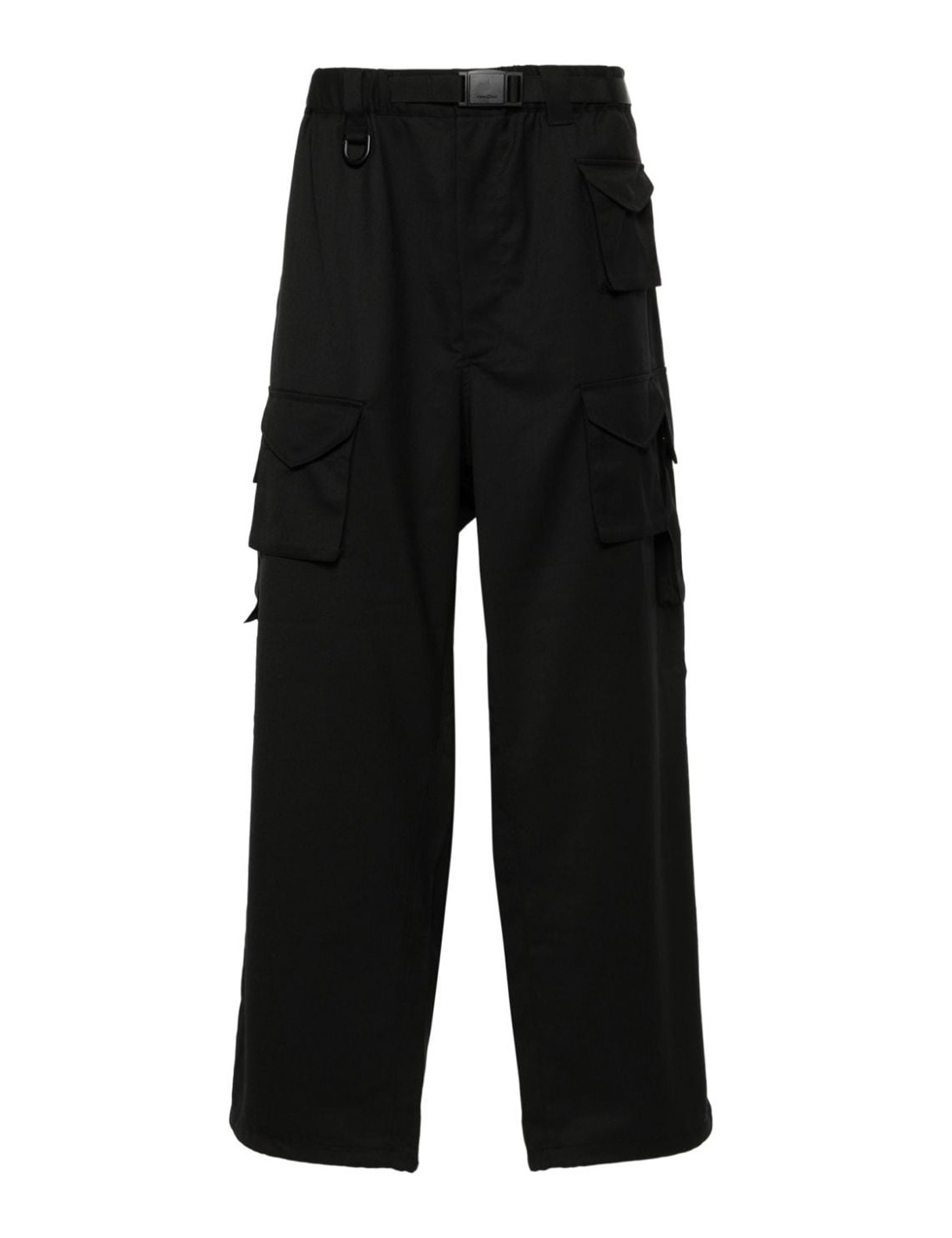 Pants in black wool and polyester, waist belt loops, pence, cargo pockets, side patch logo, 93% lyocell, 7% polyamide, Base Notes: Vetiver, Animal Musk, Sandalwood, Virginia Cedar and Leather