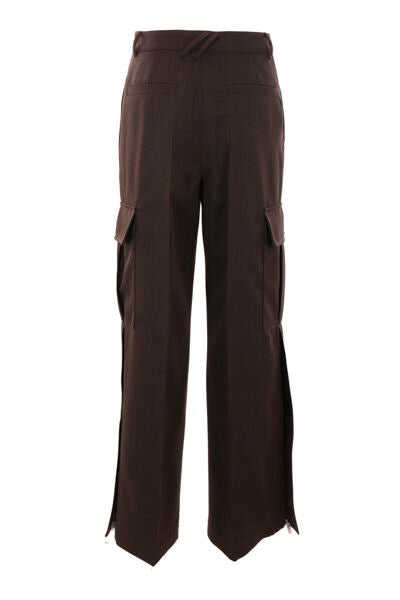Burberry's cargo trousers crafted in brown wool drill. Featuring hook / button / zip closure, belt loops, multiple pockets, front pleats, central pressed crease and side zip opening at the hem. Unlined interior.