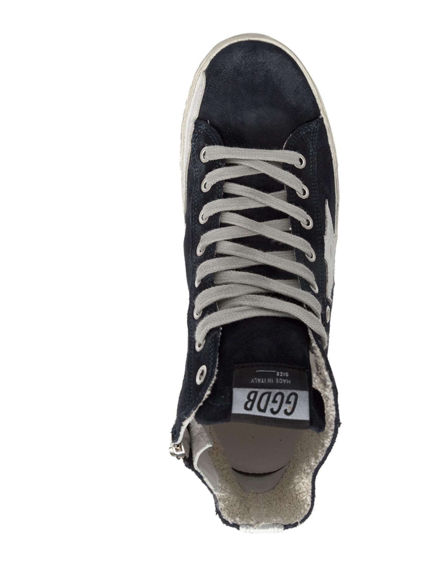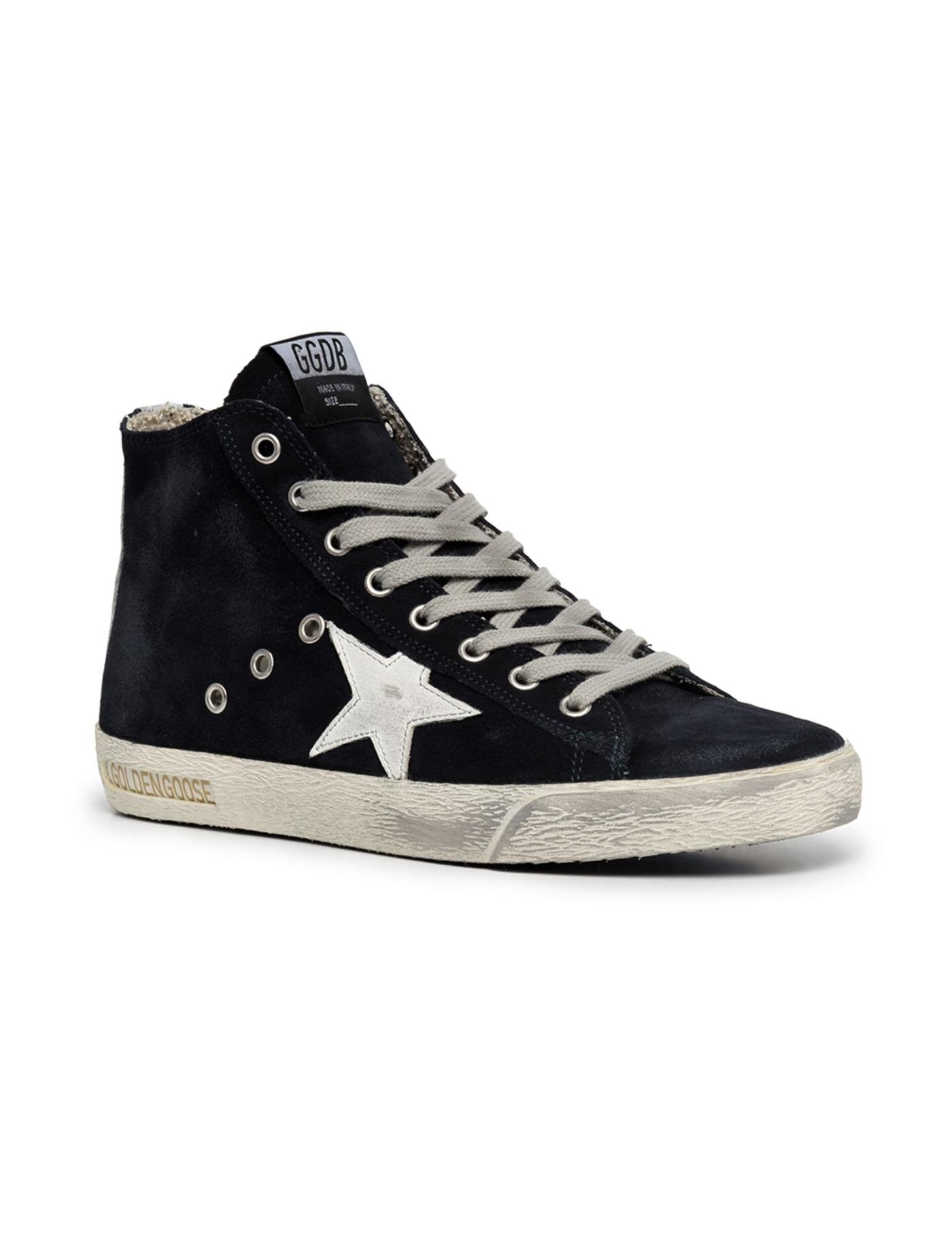 - Navy blue leather Blue Suede Francy hi top sneakers from Golden Goose Deluxe Brand featuring a round toe, a lace-up front fastening, a logo patch at the tongue, a side zip fastening, a signature star patch detail to the side, a white rubber sole and distressed effects.