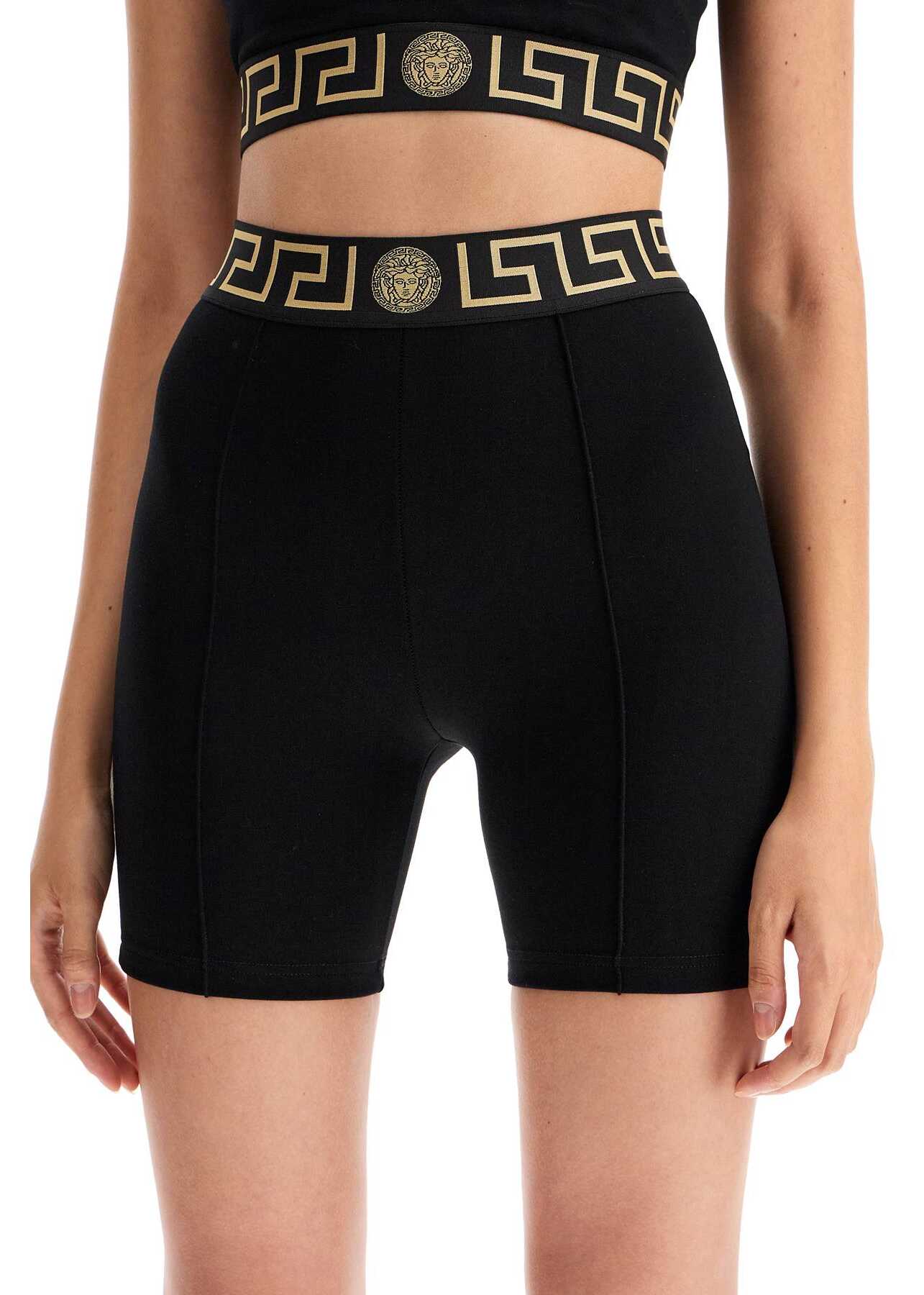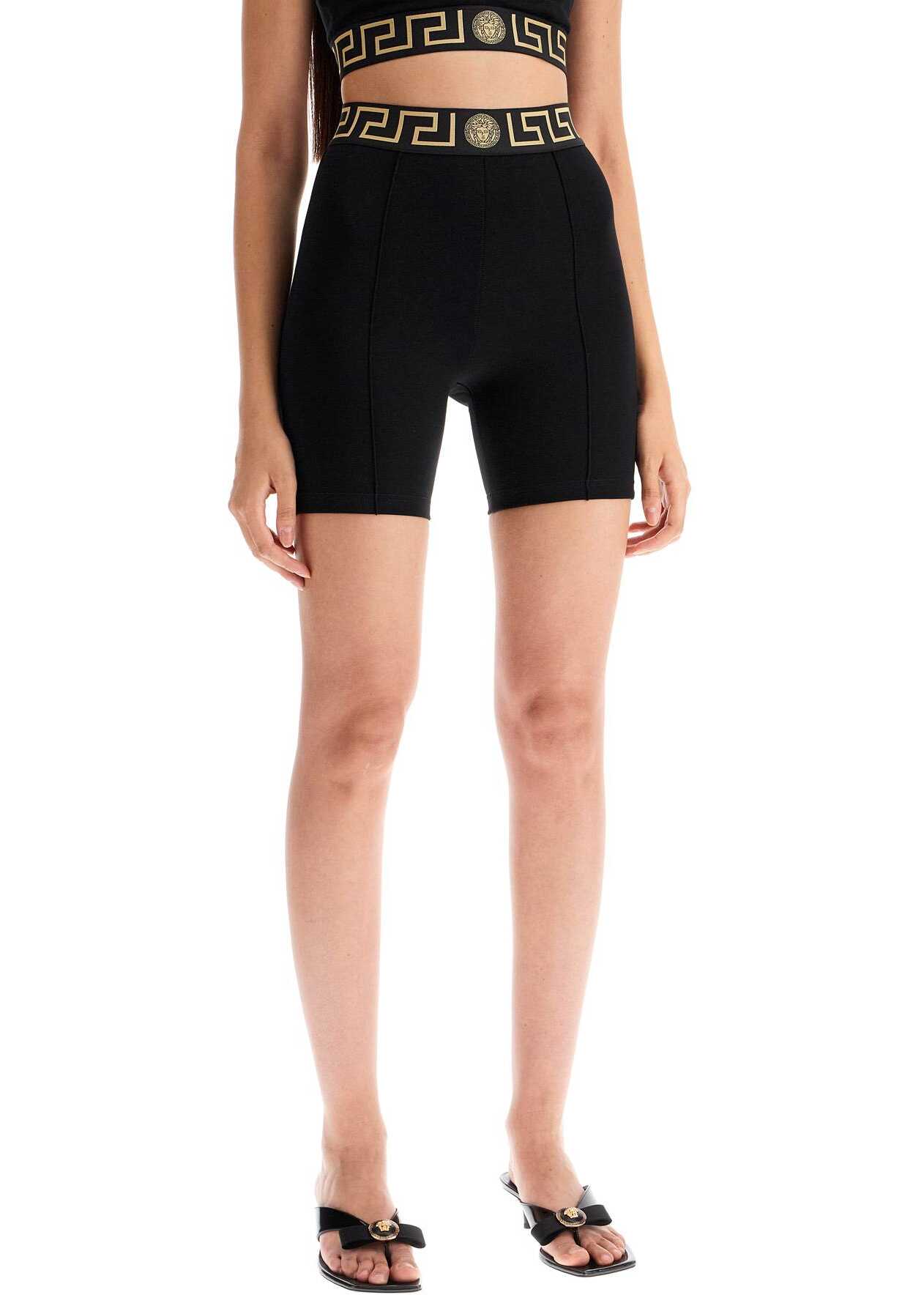 Versace sport shorts made of stretch viscose jersey worked in Milano stitch, featuring a high waist with an elastic band enriched by the iconic Greca pattern. They have a stitched fold on the leg and boast a second-skin fit. The model is 177 cm tall and wears a size XS.