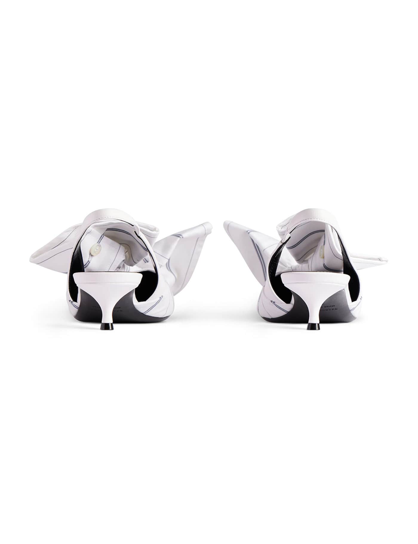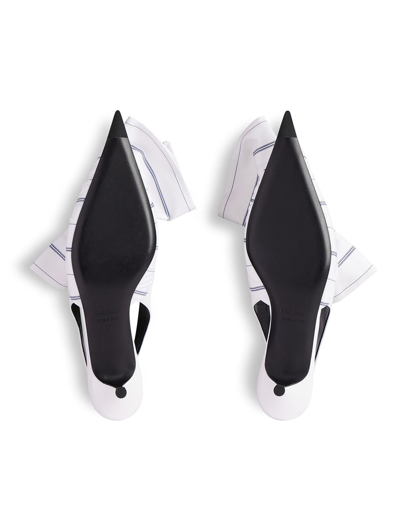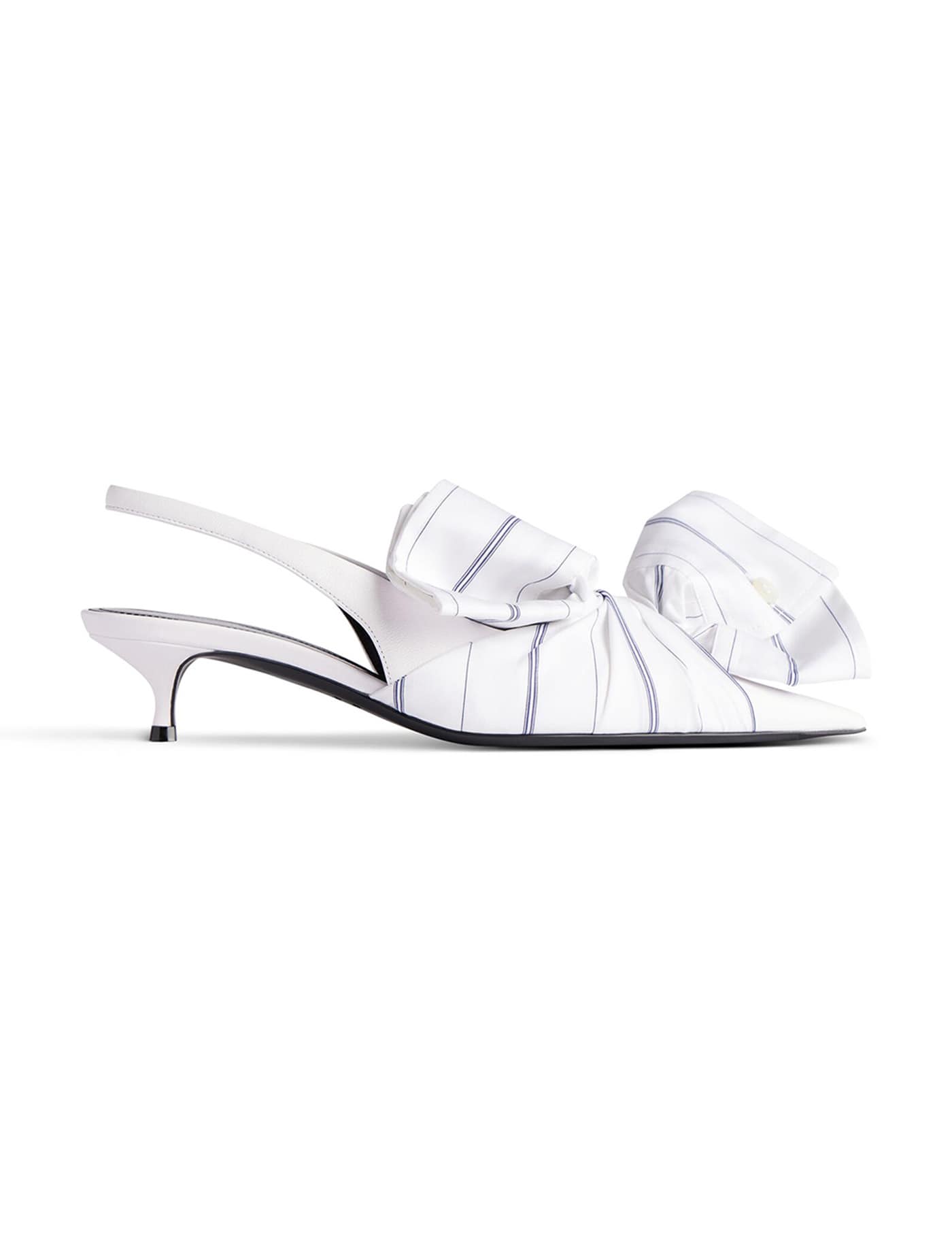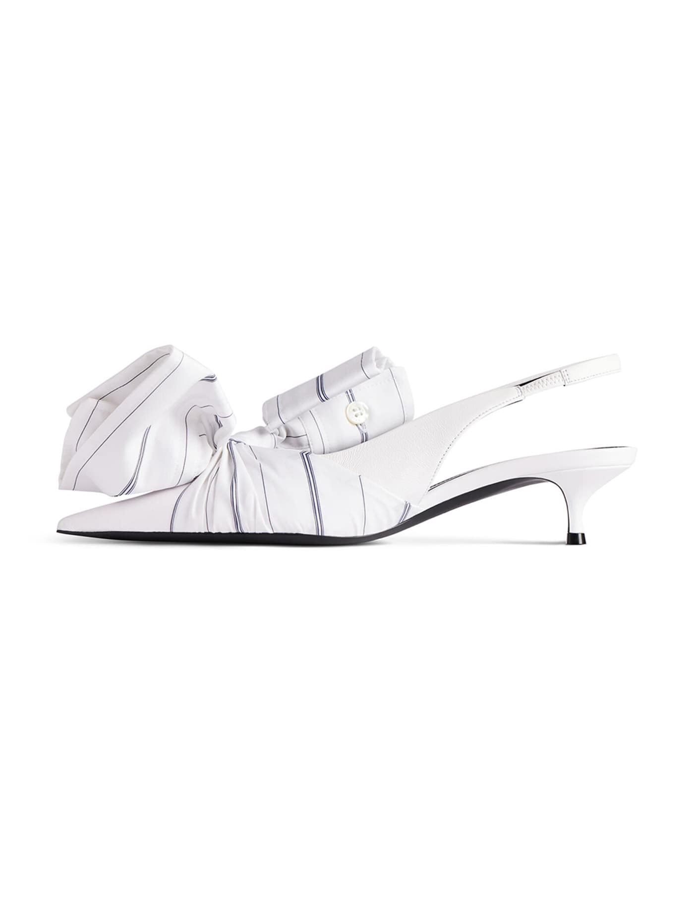 Balenciaga Chemise White Navy Leather Slingback. White cotton with blue navy striped pattern, knotted shirt cuffs detail on the top, pointed toe, sling back design, covered flat stiletto heel, branded leather insole and outsole.