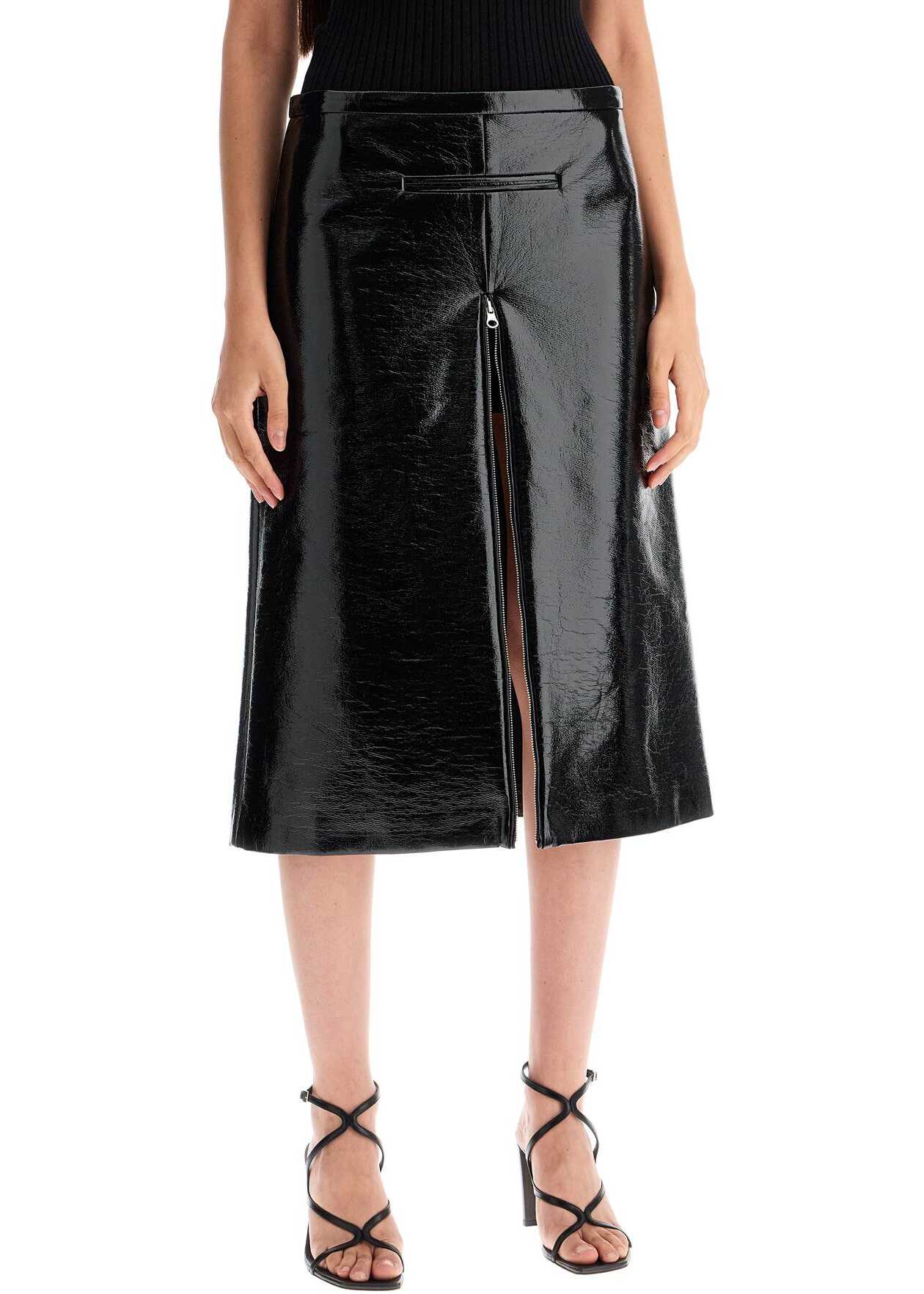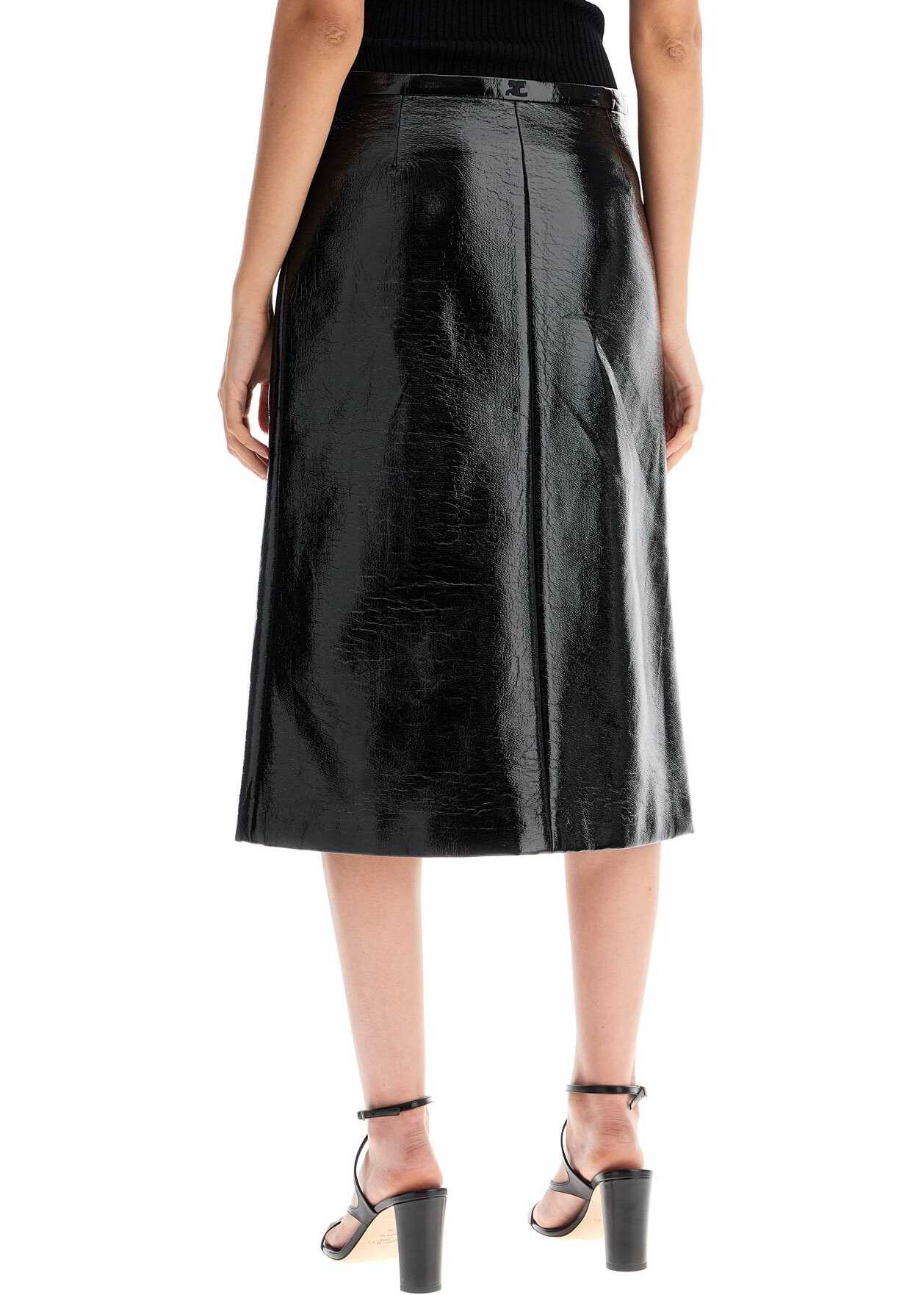 This midi skirt by Courreges is made of coated cotton with a shiny and crinkled vinyl finish. It features a front slit with a zip and a central pocket with a slit. The side closure has an invisible zip and the cut is slightly flared. The model is 177 cm tall and wears size FR 36.