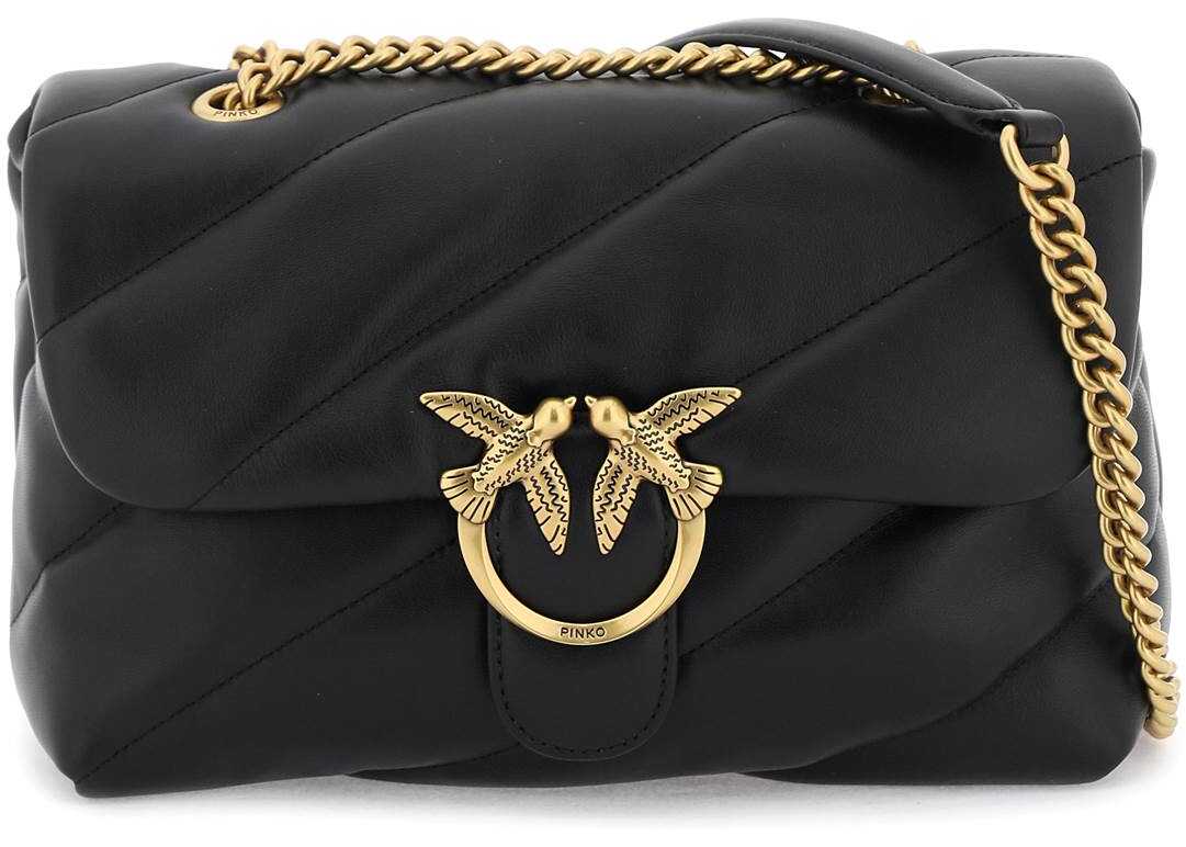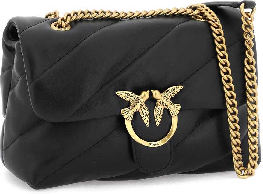 Pinko Love Classic Puff bag in soft quilted nappa leather enhanced by the oblique stitching and by the flap with the iconic metal buckle with Love Birds logo. Sliding double-handle chain shoulder strap with leather insert for a multiple look by hand, on the shoulder or crossbody. Interlocking closure and Birds embroidery on the back. Interior lined in microfiber with a flat leather pocket and two compartments divided by a central zip pocket. Antique gold-finished metalware.