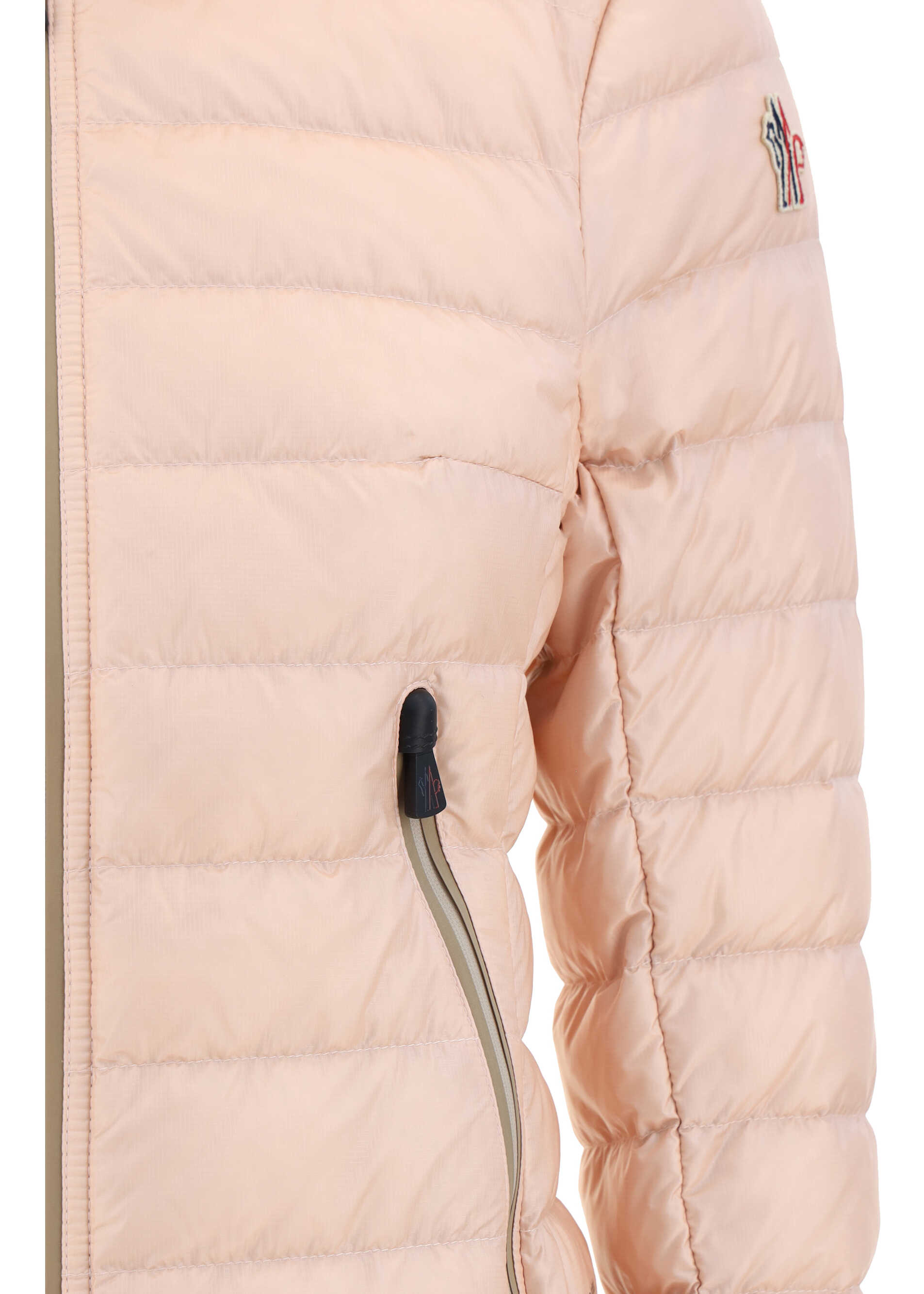 Walibi Down Jacket by Moncler Grenoble, high collar, front closure by double-slider zipper, two side welt pockets, elasticized cuffs, iconic brand logo patch applied on left sleeve, all-over quilted and padded design, monochrome pattern, regular fit.