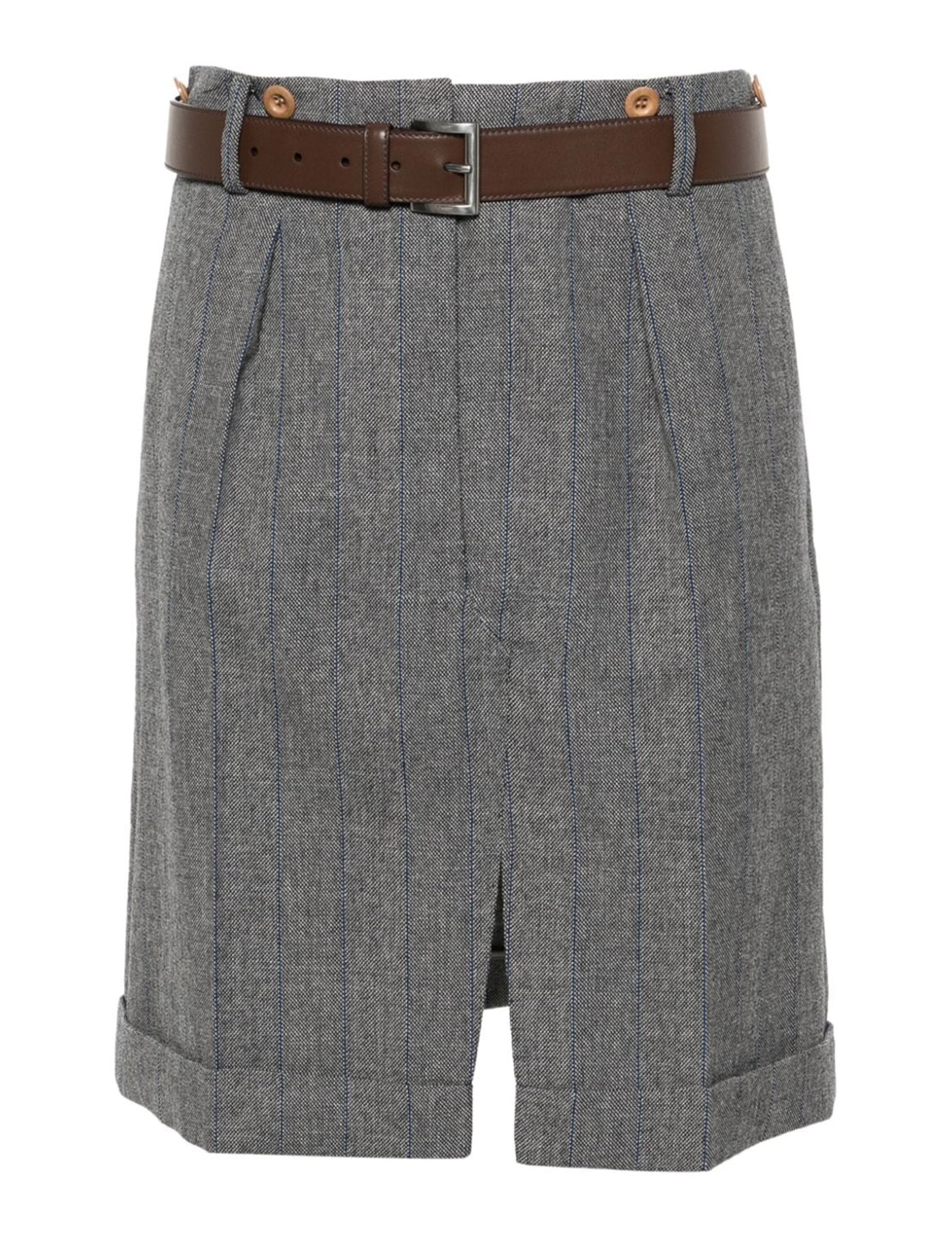 Wool Skirt by Prada, front button closure, two side welt pockets, one back slit pocket, pinstripe pattern, waistband loops, adjustable and removable matching belt, front and back slit, turned-up hem, regular fit.