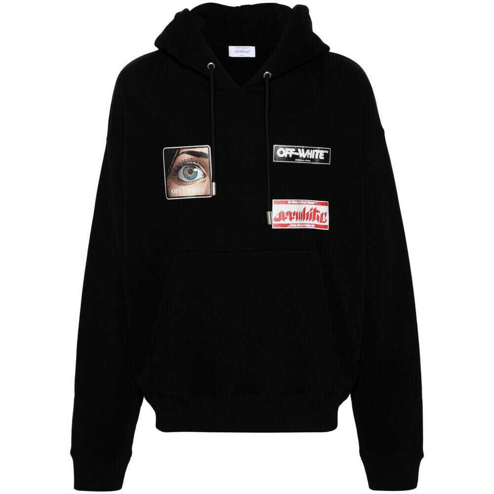 Black cotton jersey texture drawstring hood drop shoulder long sleeves ribbed cuffs and hem graphic-print patches to the front front pouch pocket short side slits logo print to the rear straight hem