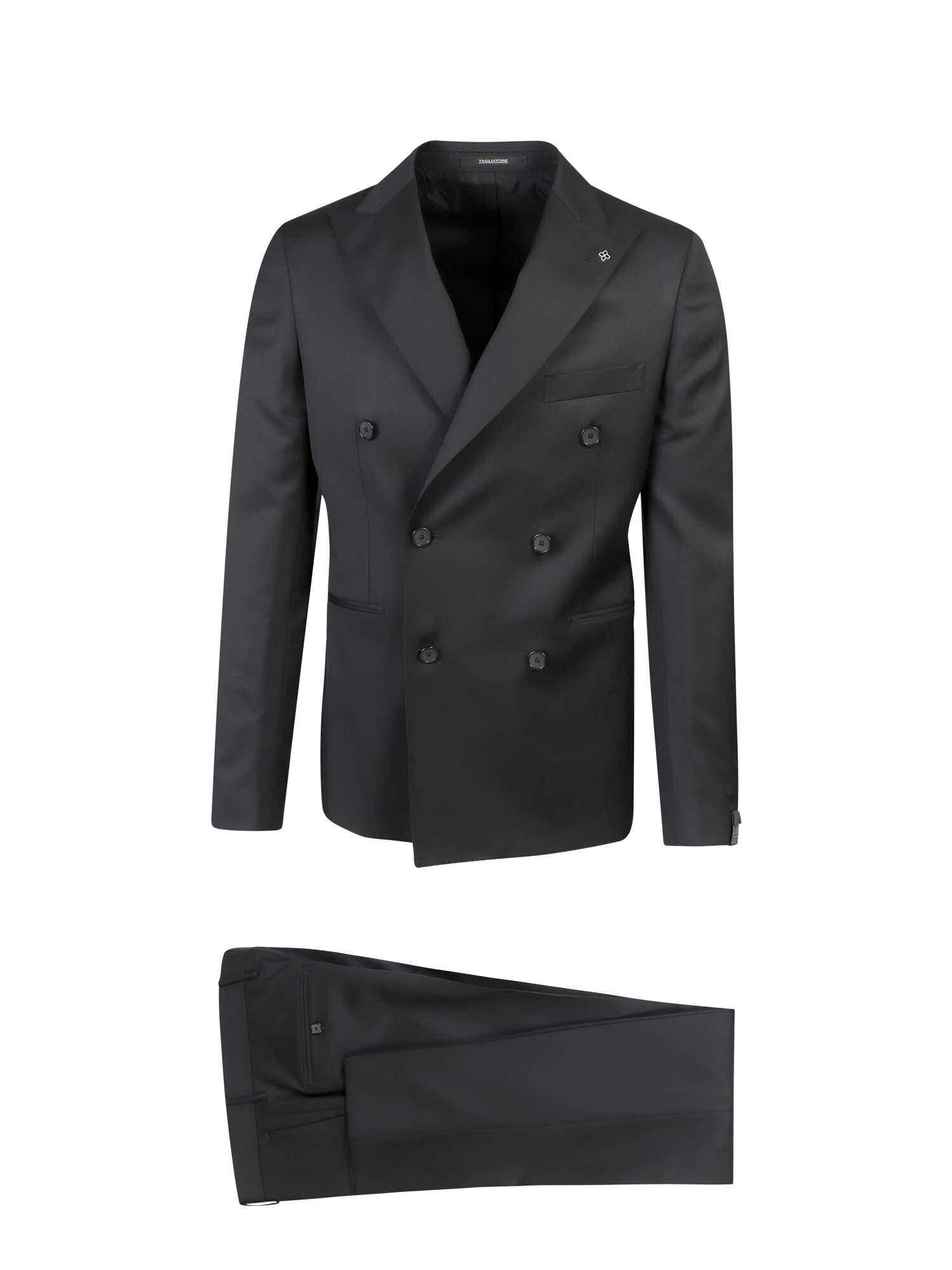 Look sharp and sophisticated in our black double-breasted virgin wool suit with peak lapel. Made in Italy with 100% premium materials, the blazer features button closure, breast pocket and two welt pockets. The trouser has zip and button closure. Available in size range IT, this TAGLIATORE suit is perfect for any formal occasion.