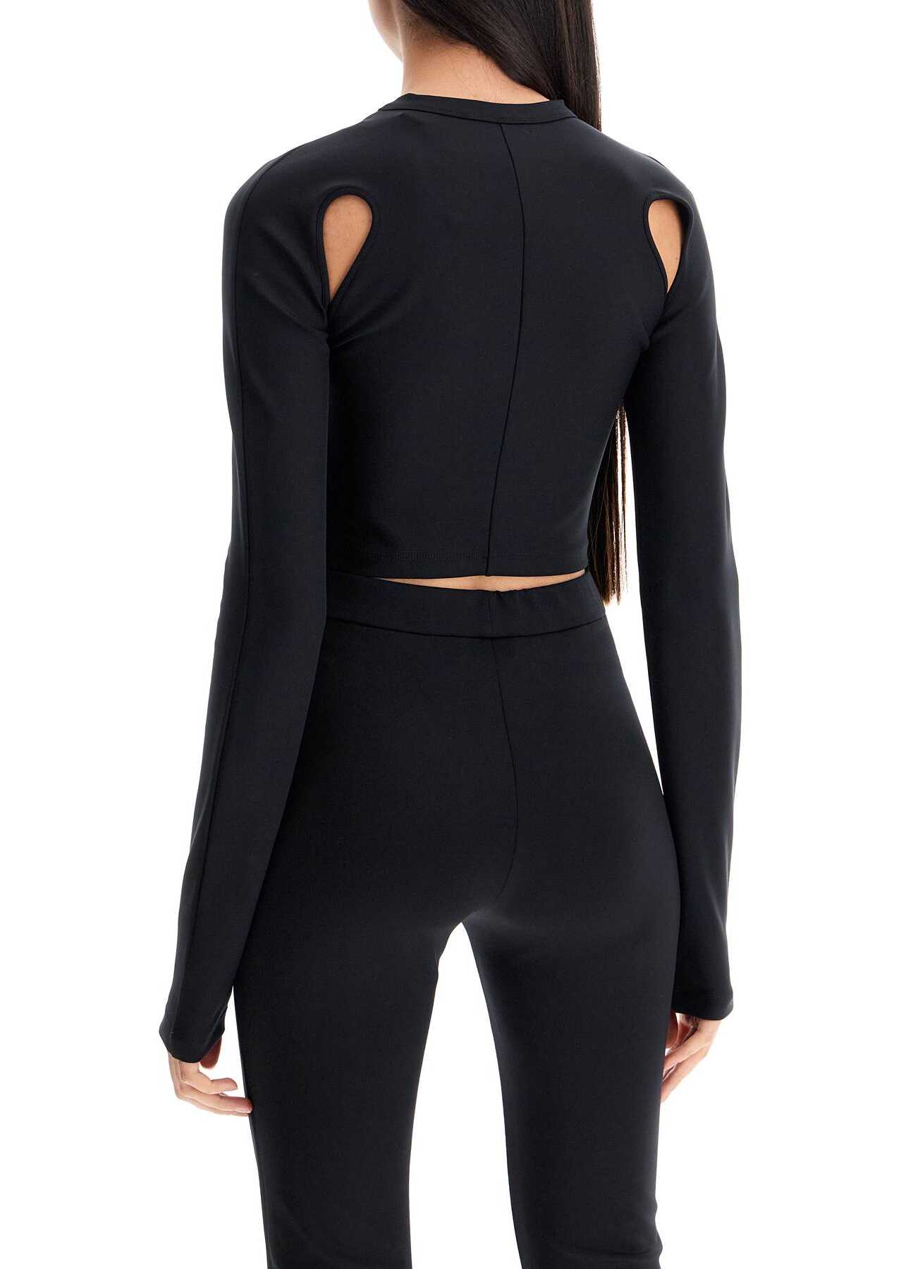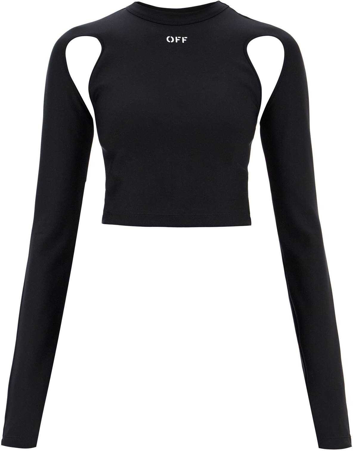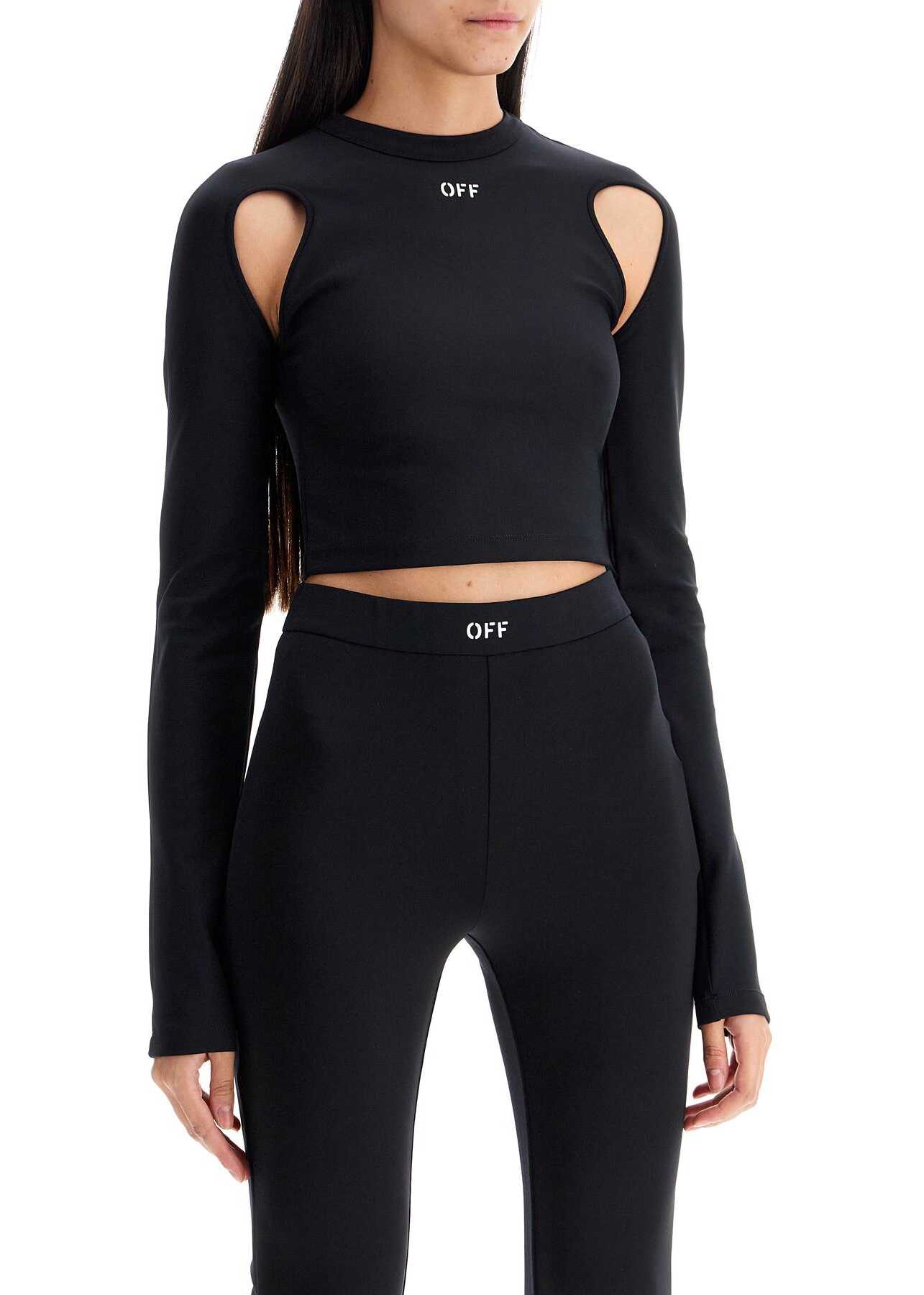 This Off-White long-sleeved top is made of stretch technical jersey, featuring a fitted and cropped fit and cut-out details on the sleeves. Decorated with a contrasting OFF logo stencil print. The model is 177 cm tall and wears size IT 38.