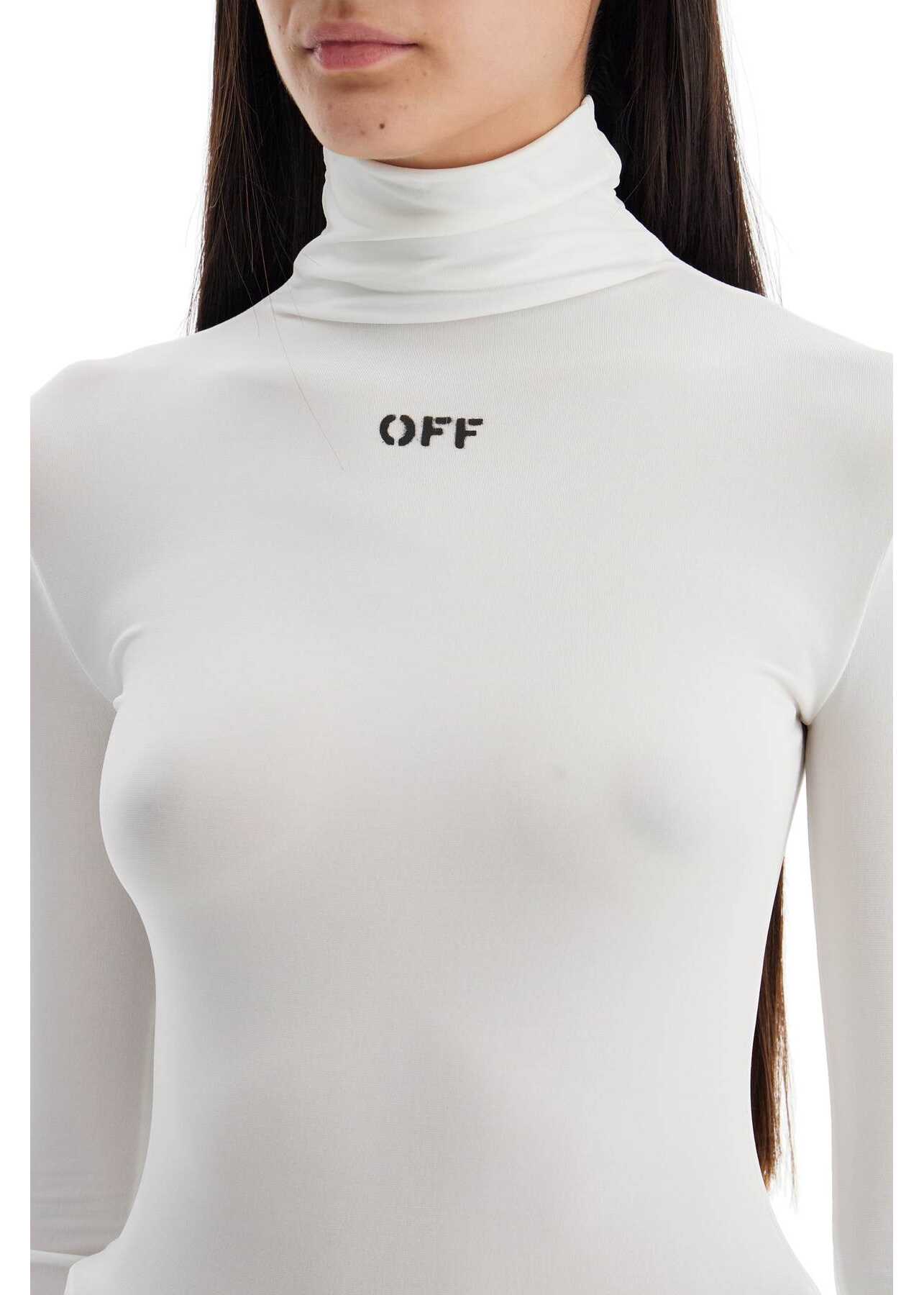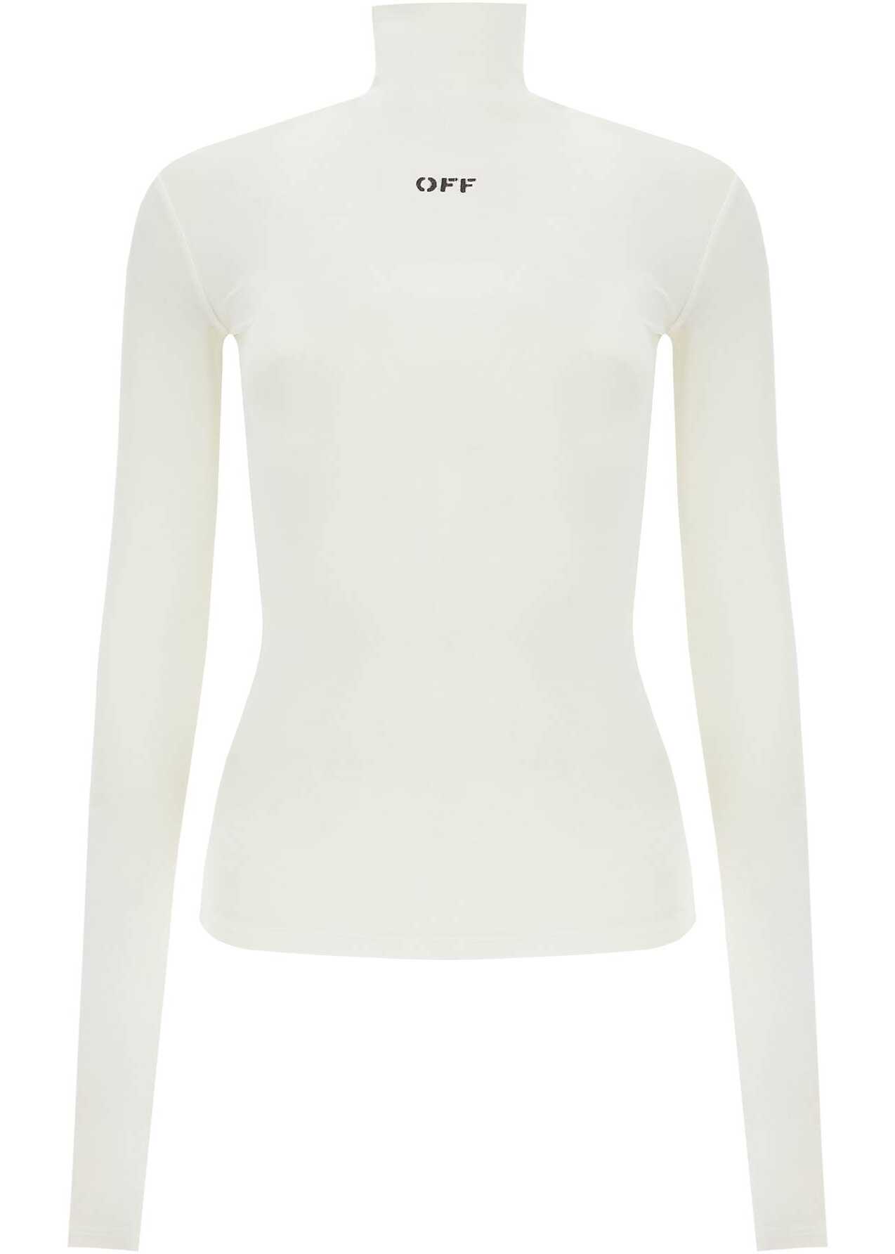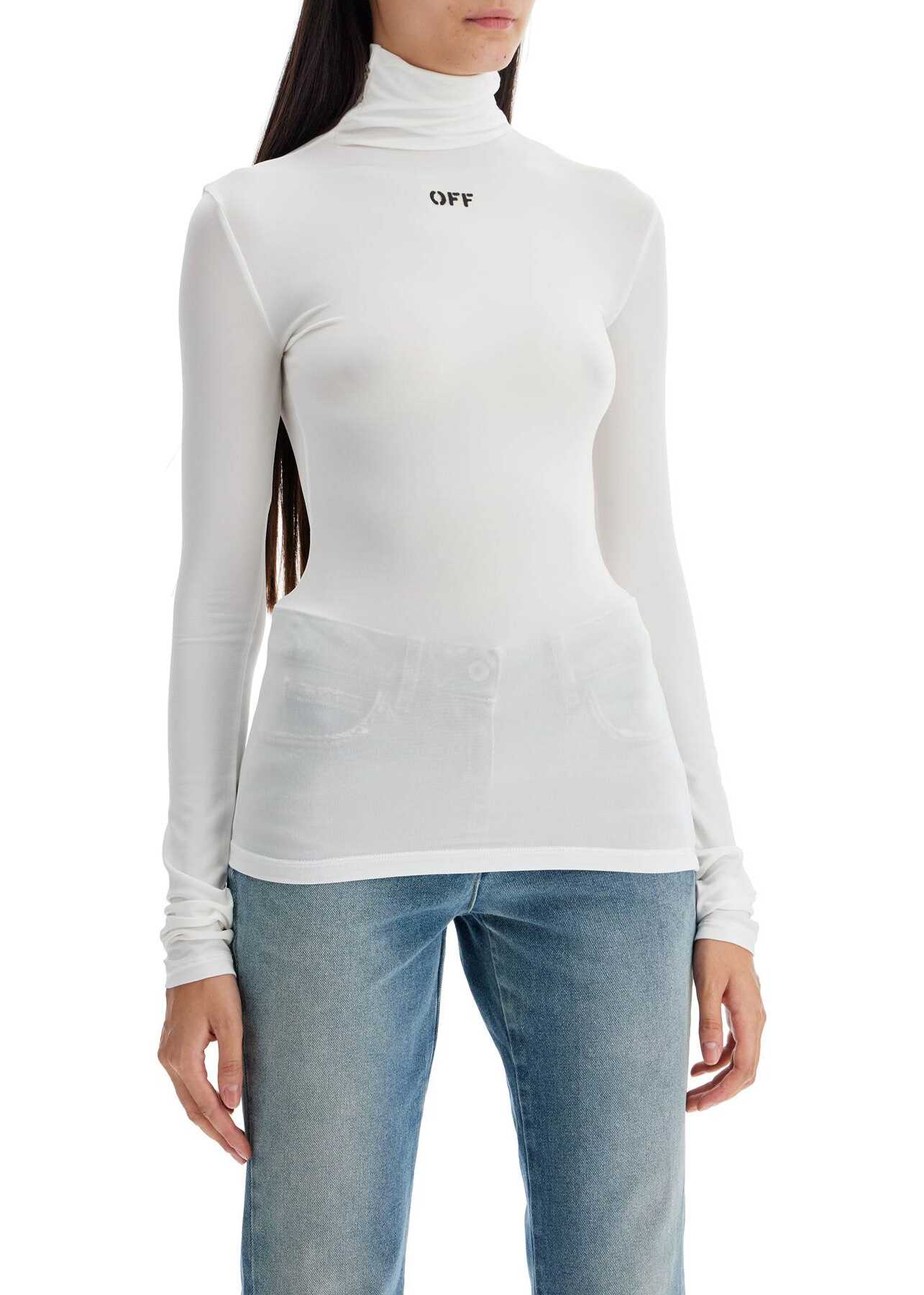 Off-White second skin top made from stretch viscose jersey with turtleneck and long sleeves. It features a logo detail at the front printed with a stencil effect. The model is 177 cm tall and wears a size IT 38.