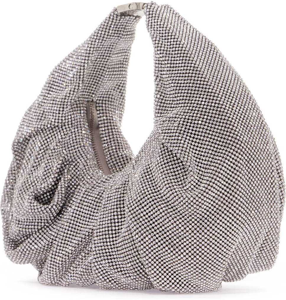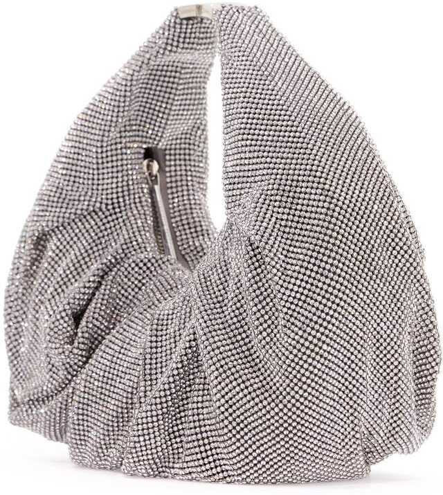 The Yennefer handbag by Benedetta Bruzziches is made of twisted and slouchy crystal mesh. It features a zip closure, an open handle, and a silk satin lining on the inside.