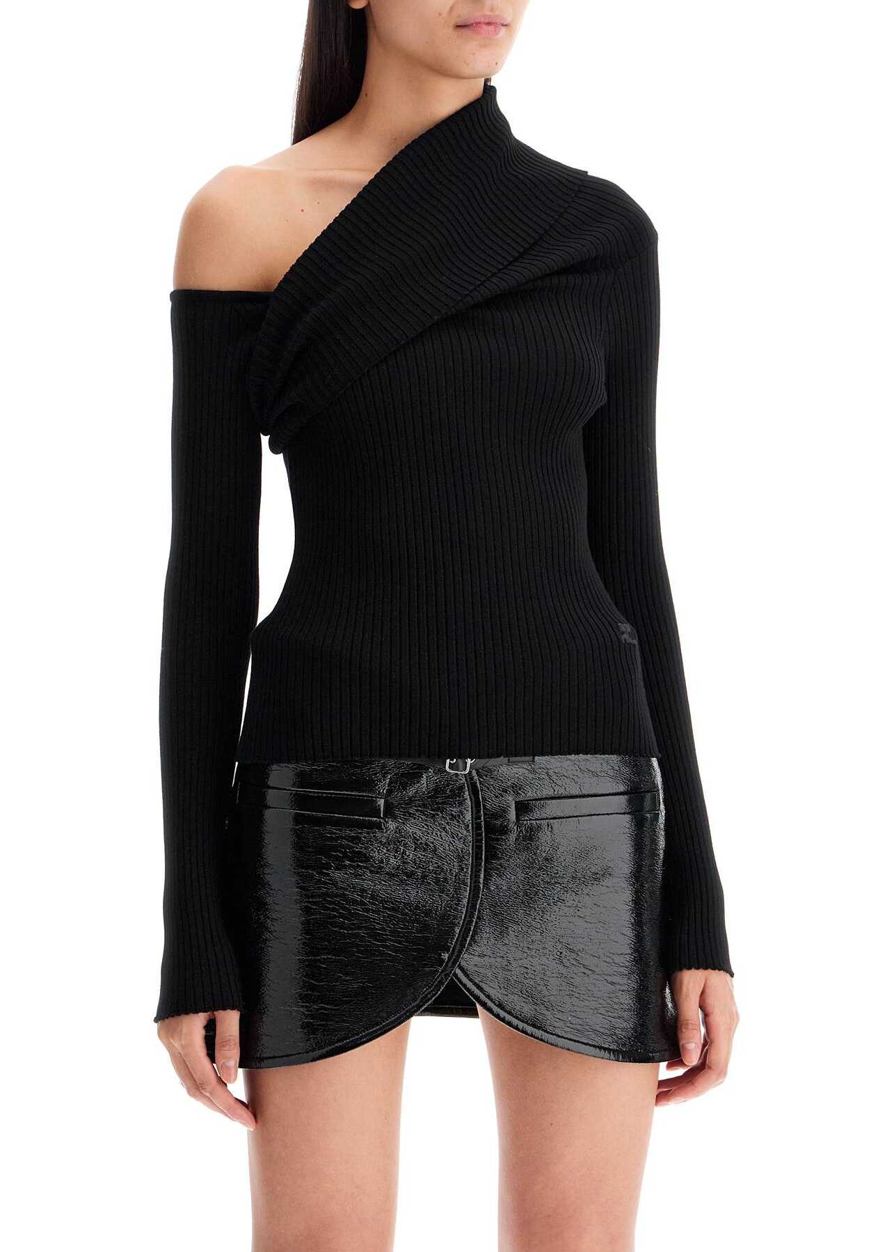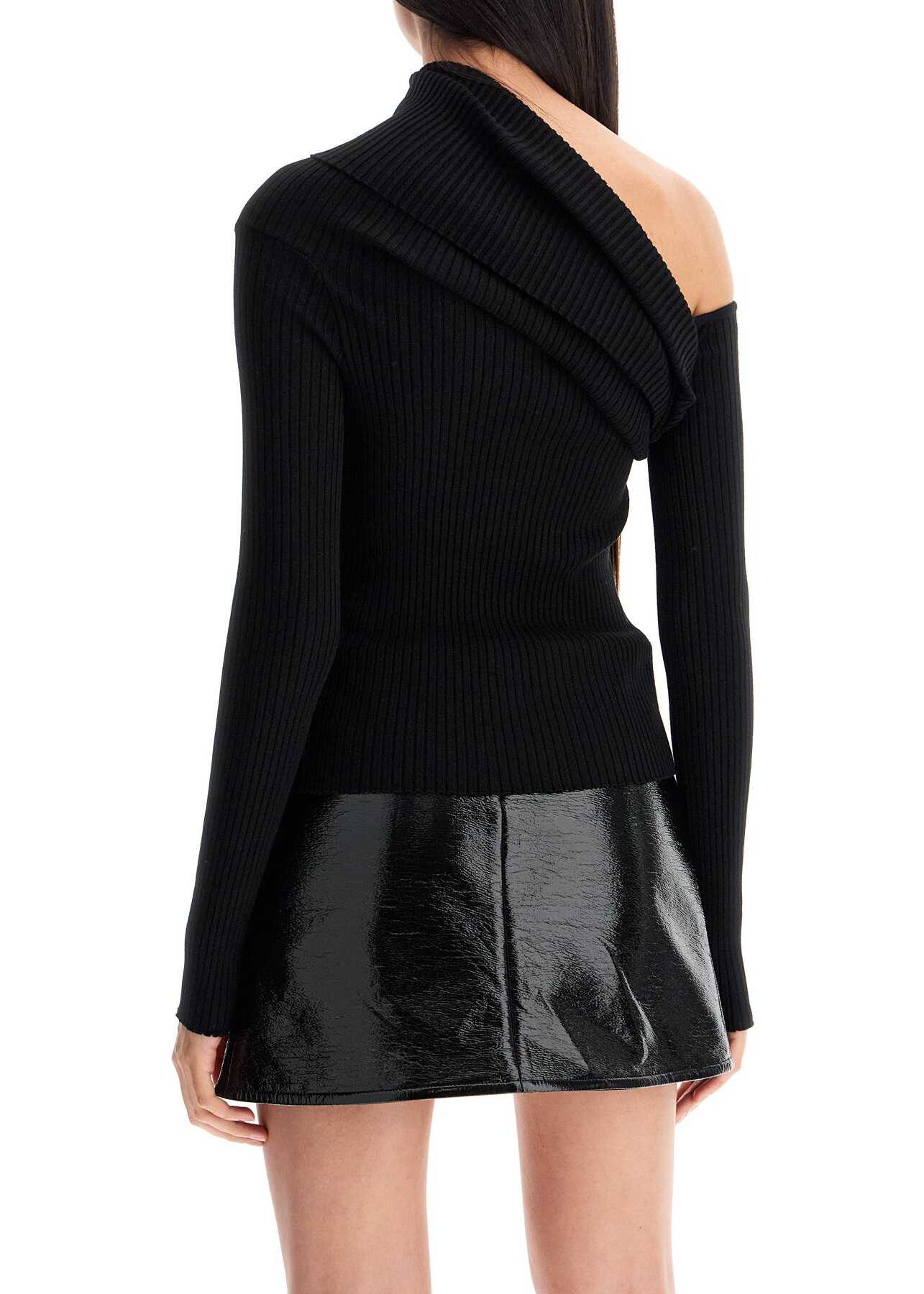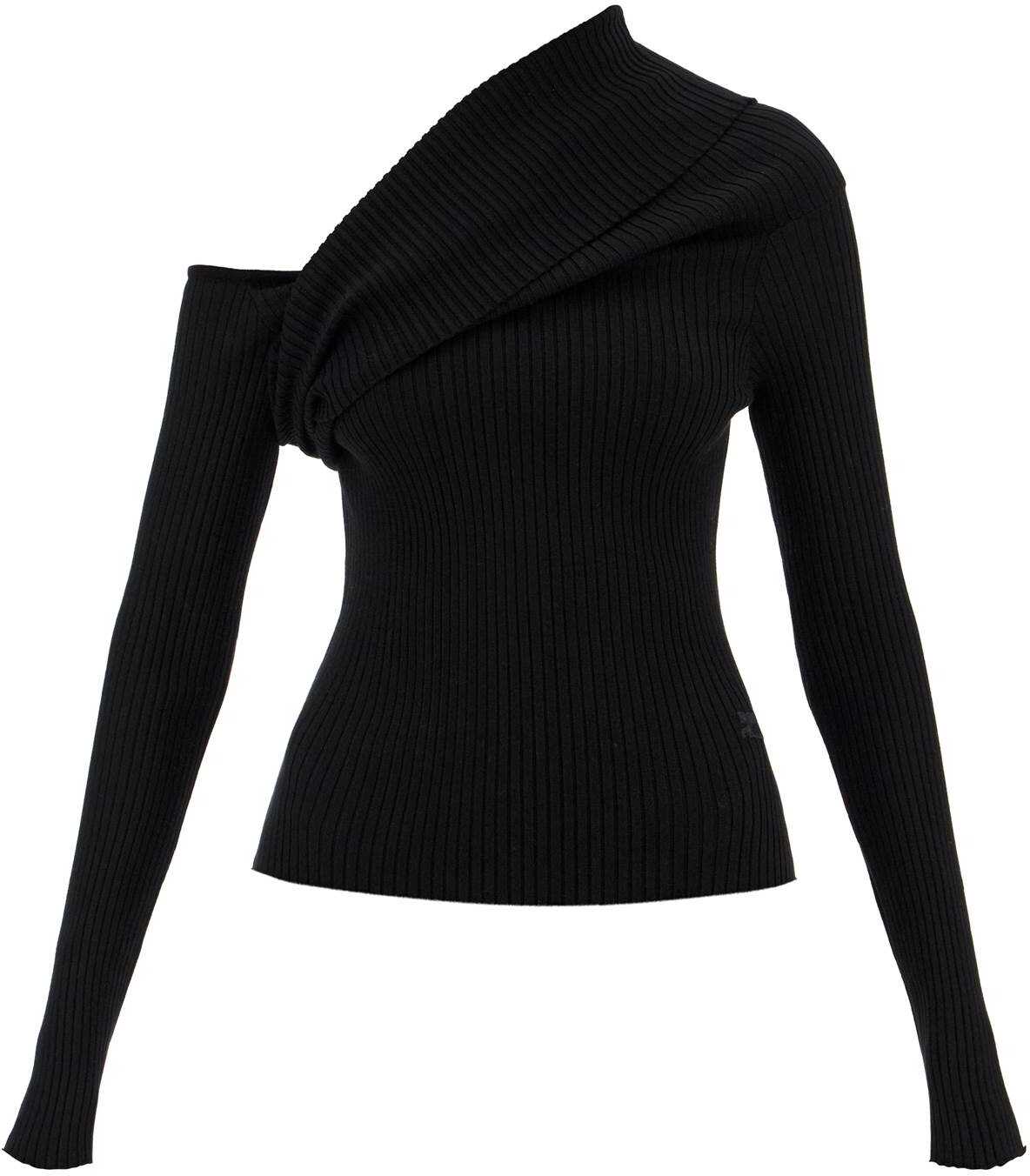 This Courrèges one-shoulder pullover is made of ribbed stretch viscose blend and features an asymmetrical neckline that wraps around the neck and ends at the underarm. Finished with a tonal embroidered AC logo on the bottom. The model is 177 cm tall and wears size S.