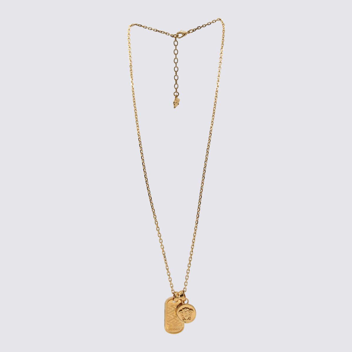 Gold tone metal La Greca Tag from Versace featuring La Greca pendant, medusa pendant and lobster clasp closure.