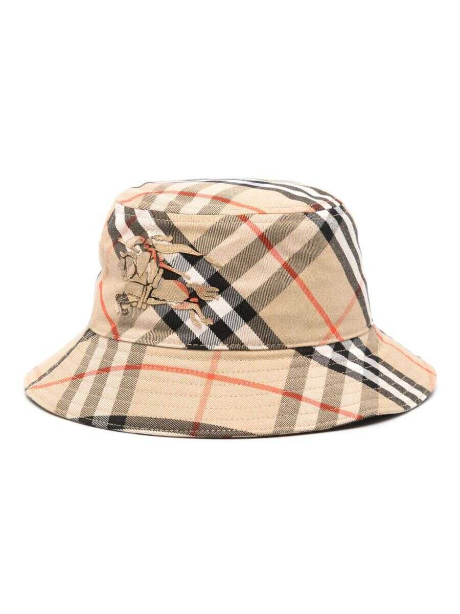 archive beige recycled polyester blend interlock twill weave Vintage Check pattern signature Equestrian Knight motif dropped narrow brim This item is made from at least 50% recycled or upcycled materials. For recycled synthetic clothing products, we highly recommend using a microfibre-catching washing bag to ensure that no microplastics that can pollute water are released in the process. We've partnered with Good On You — an independent agency that rates how brands perform in relation to their impact on the planet, people and animals, with a multi-criteria rating simplified to a five points scale. In order to be awarded our conscious label, larger brands need to score a minimum of four out of five ('Good'), while smaller brands must score at least three out of five ('It's A Start'). This item comes from a brand rated three out of five ('It's A Start') by Good on You at the time it was added on FARFETCH. Please note, this is a brand-level rating and does not guarantee that this product
