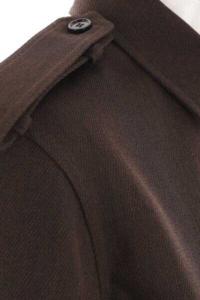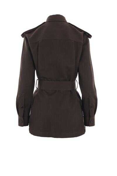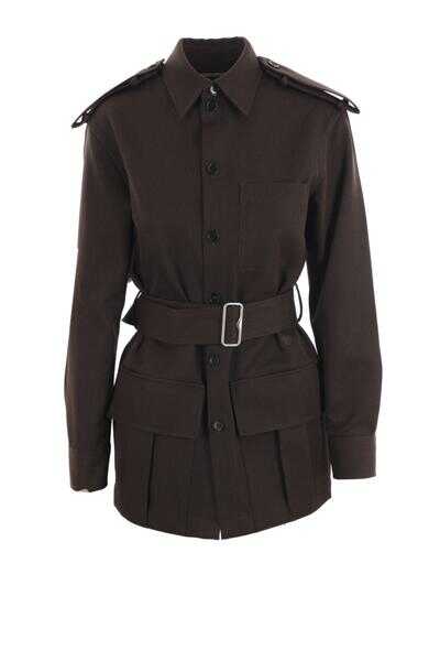 Burberry's bush jacket crafted in brown wool drill. It features shirt-style collar, button closure, multiple pockets, button-tab shoulders, long sleeves with buttoned cuffs, straight hem and unlined interior. The design is completed by the iconic Equestrian Knight embroidery on front.