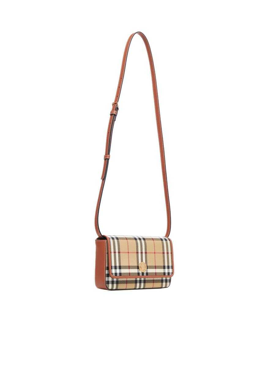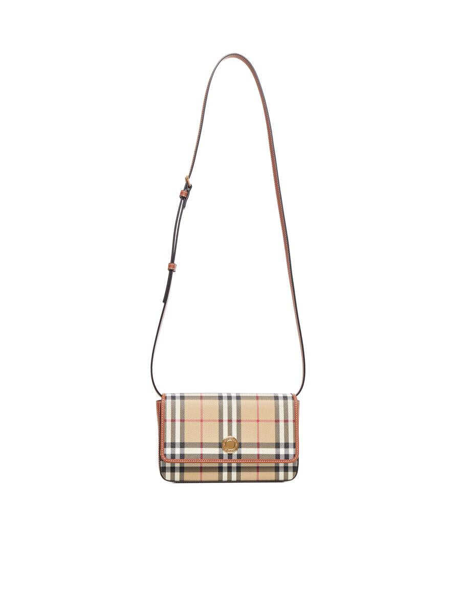 Burberry’s Hampshire bag in iconic check motif coated cotton blend canvas in beige tones and tan leather featuring an adjustable and detachable shoulder strap, concealed magnetic fastening, internal slip pocket and gold-tone metal hardware.