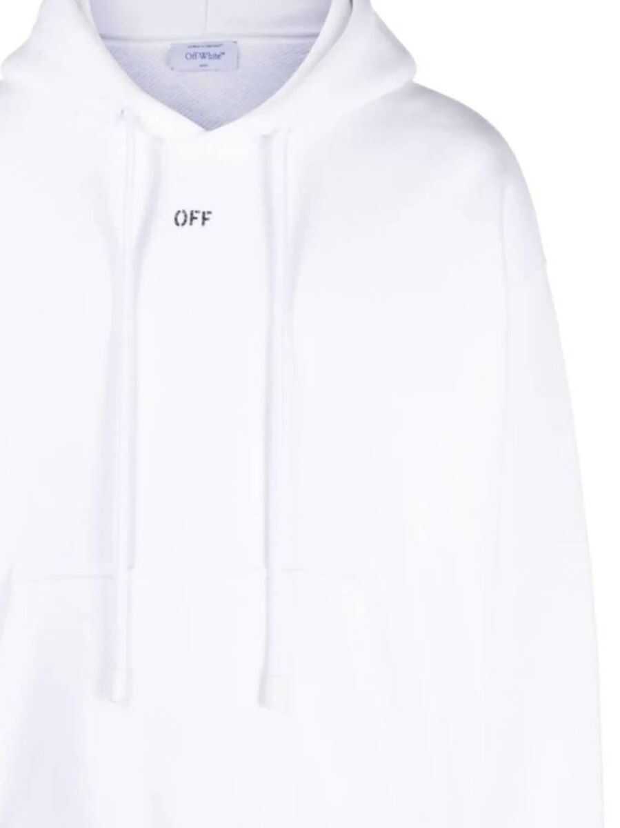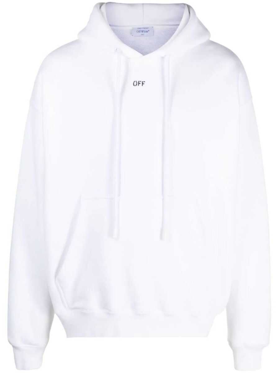 logo-print cotton hoodie from OFF-WHITE featuring white, cotton, logo print at the neckline, drawstring hood, drop shoulder, long sleeves, front pouch pocket and ribbed cuffs and hem