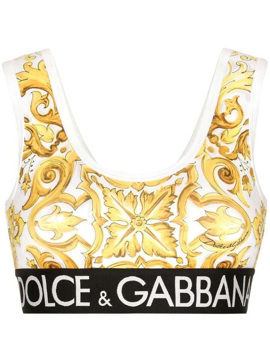 white/black/canary stretch jersey majolica print underbust band logo crew neck wide straps sleeveless short hem short