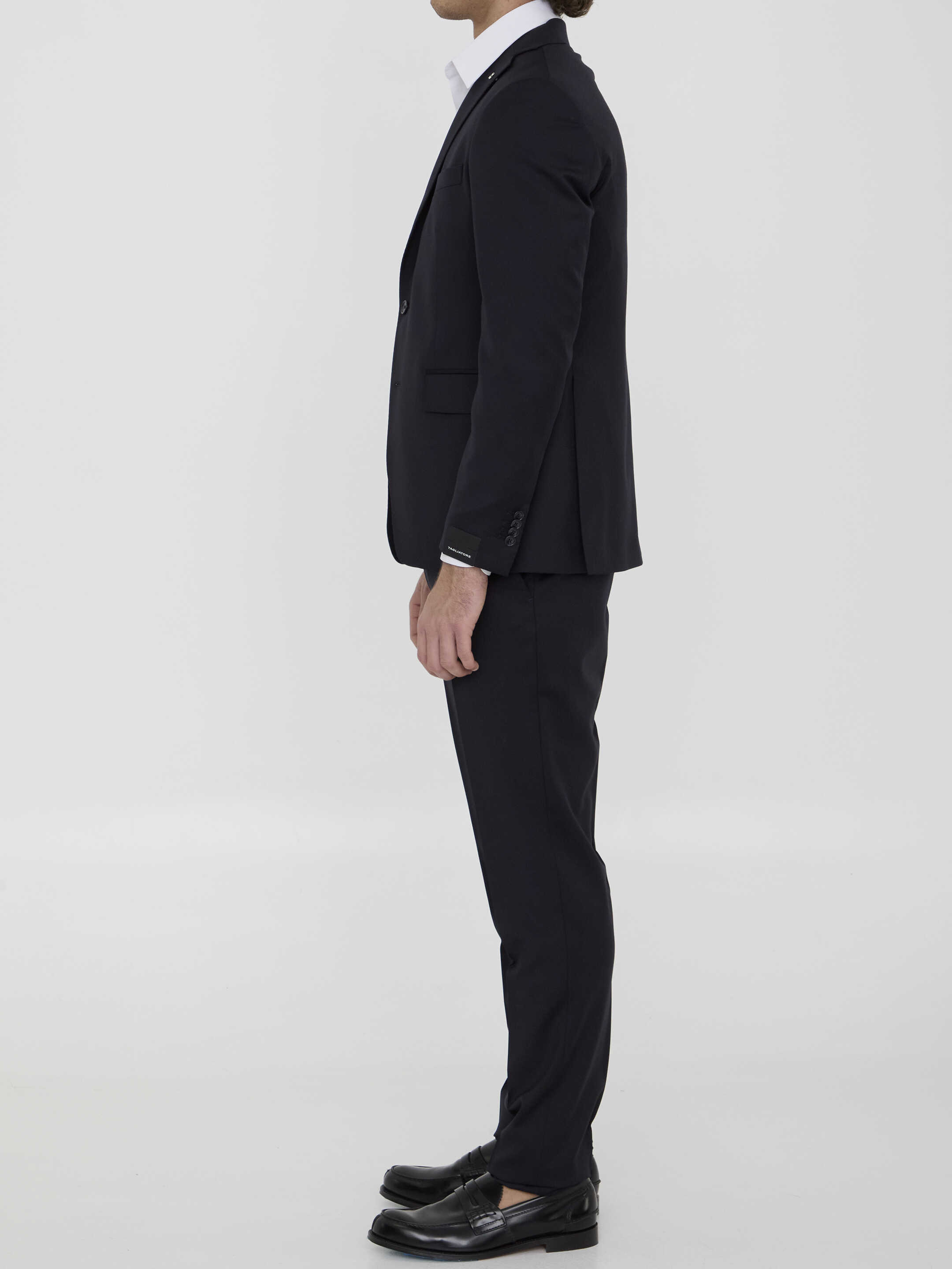 Two-piece suit in blue virgin wool with a slightly shiny effect. Single-breasted jacket with peaked lapels and brooch on lapel, front button closure, two front flap pockets, a welt pocket on chest and buttoned cuffs. Straight-leg trousers with zip and button closure, two side welt pockets, two rear buttoned welt pockets and belt loops. Regular fit.