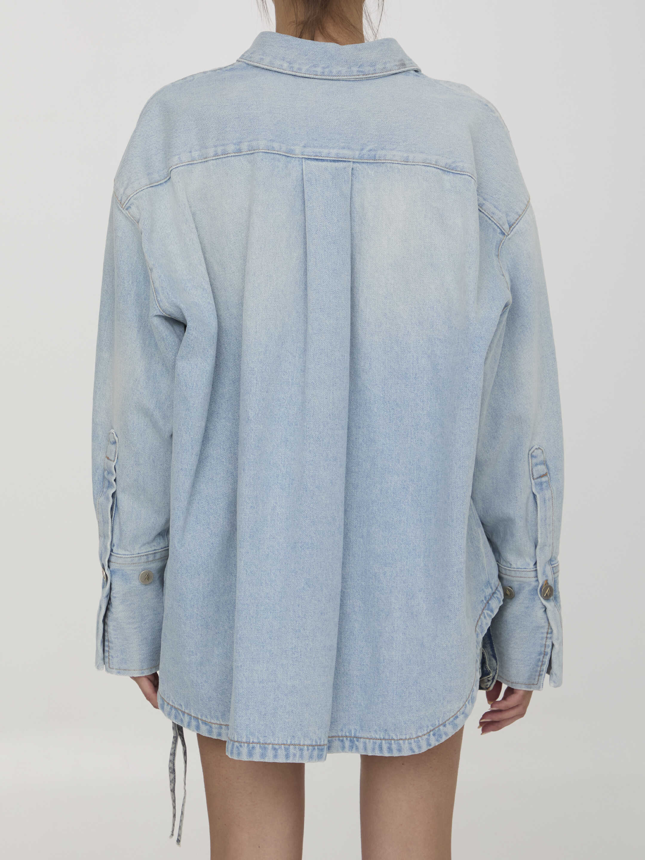 Light blue denim shirt. It features classic collar, front button closure, The Attico logo embroidered on chest, side slit and buttoned cuffs. Oversized fit.