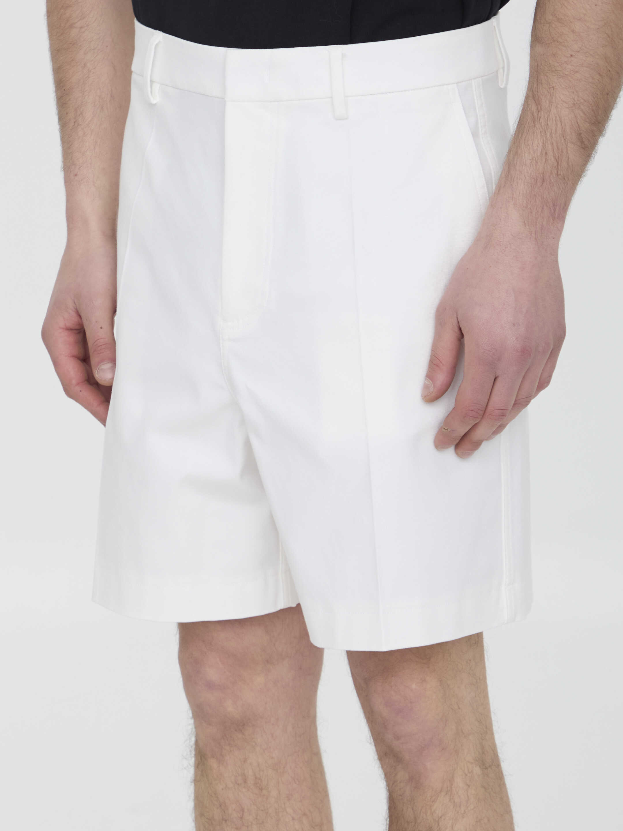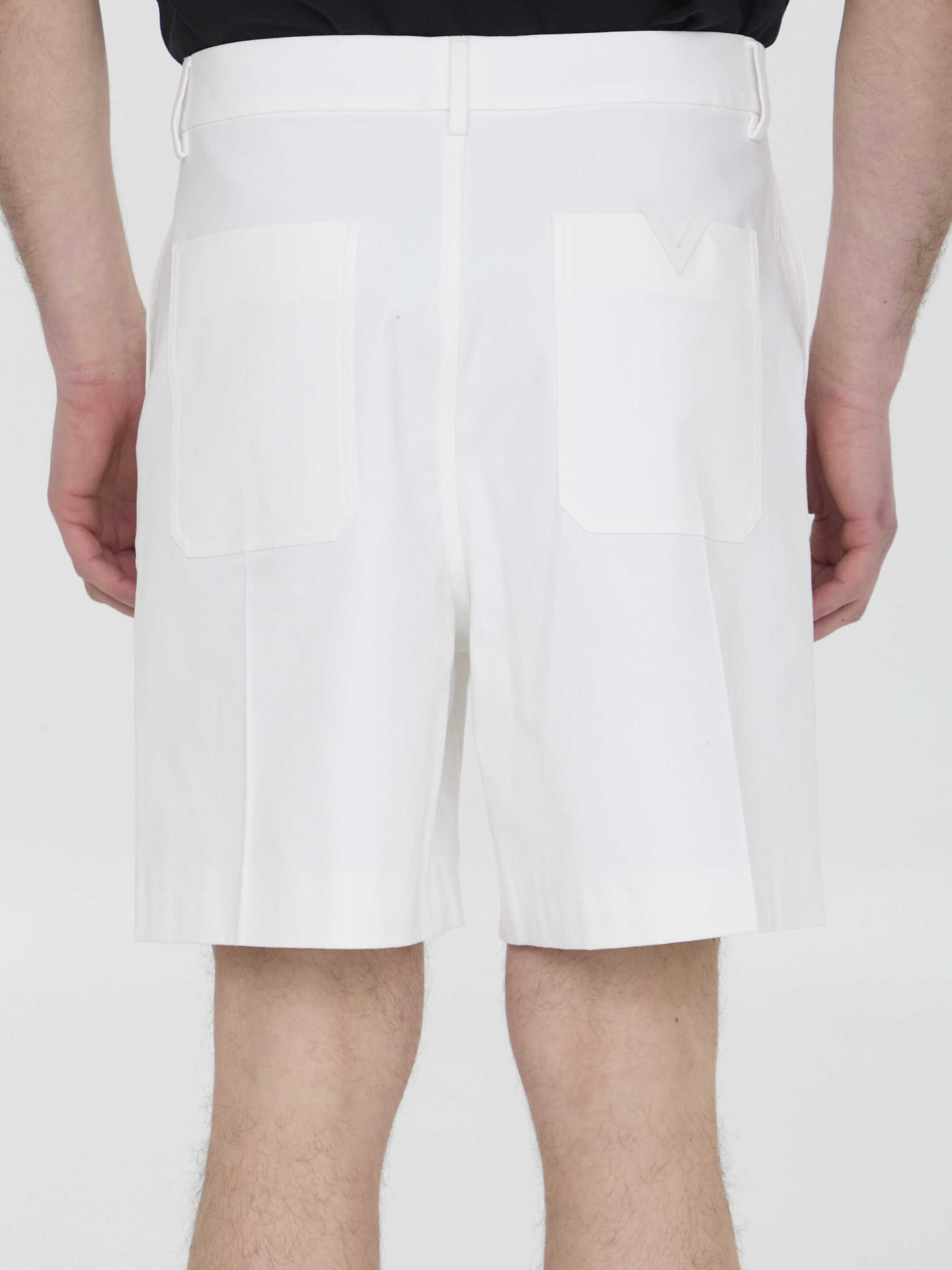 Valentino bermuda shorts in white stretch cotton canvas with rubberized V Detail at the back. It features zip, button and hook-and-eye closure, two side welt pockets, two rear patch pockets and belt loops. Regular fit.