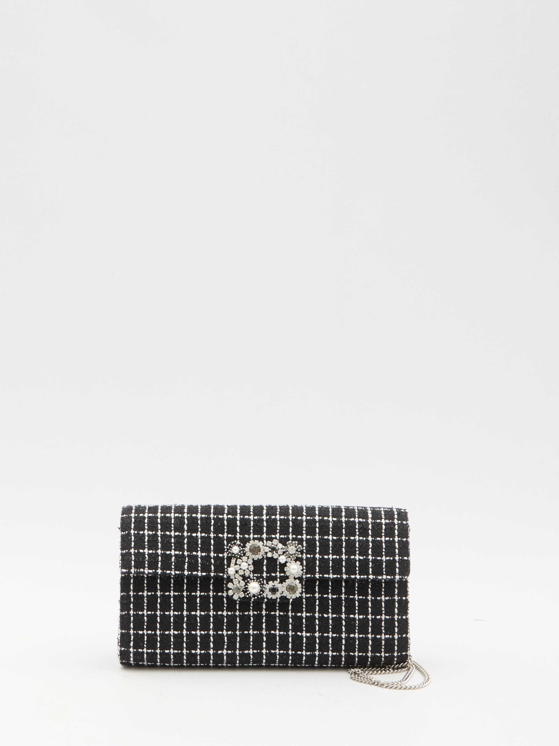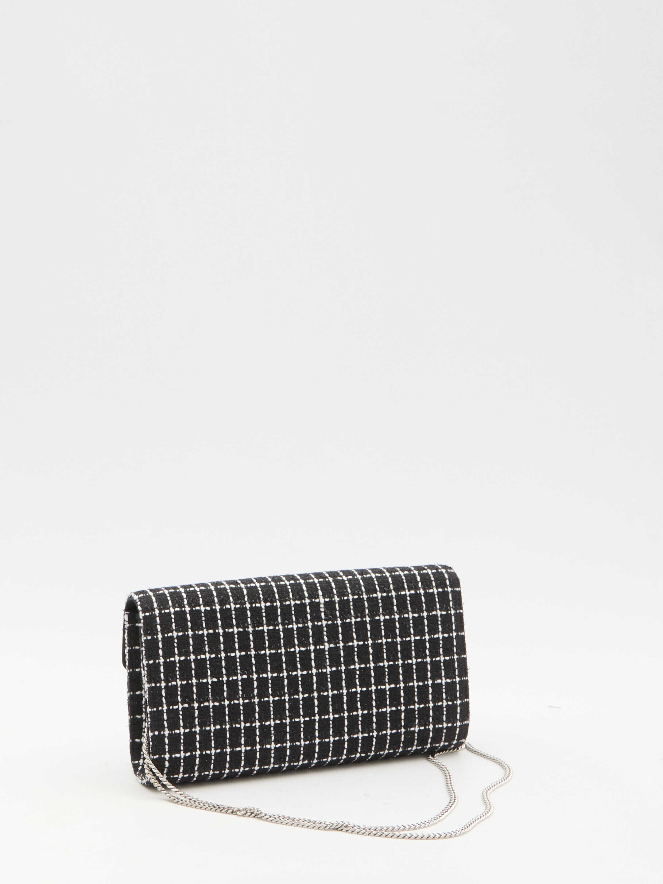 Efflorescence clutch in black and white tweed with check pattern. It features crystal and bead buckle, chain shoulder strap, magnetic closure, one main interior compartment and one interior card slot. Silk blend fabric lining.