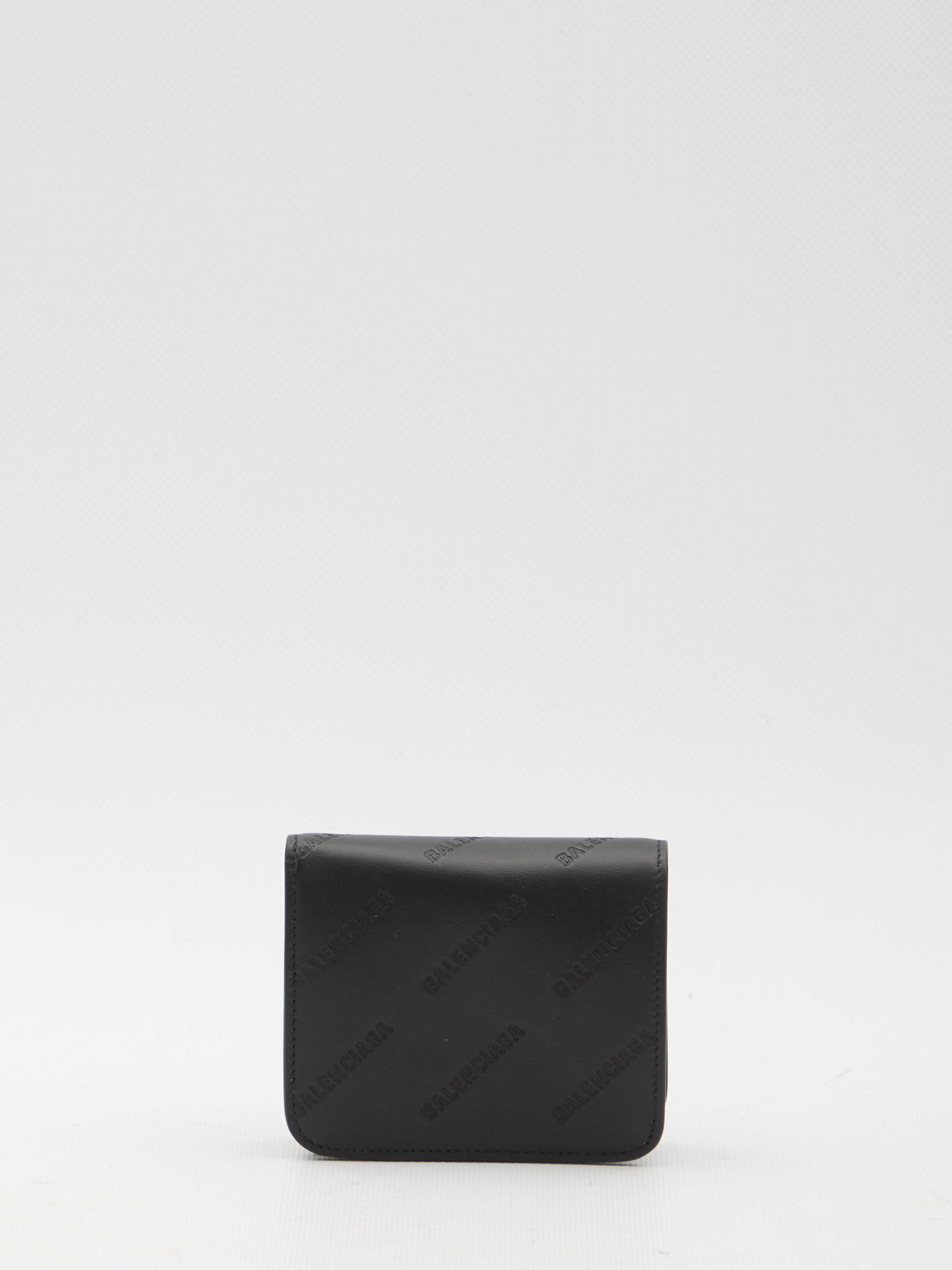 Soft black lambskin wallet with all-over embossed Balenciaga logo. It features snap-button closure, one snap-button coin pocket, one bill compartment and six card slots. Any leather imperfections are not to be considered manufacturing defects, but a peculiarity of the material.