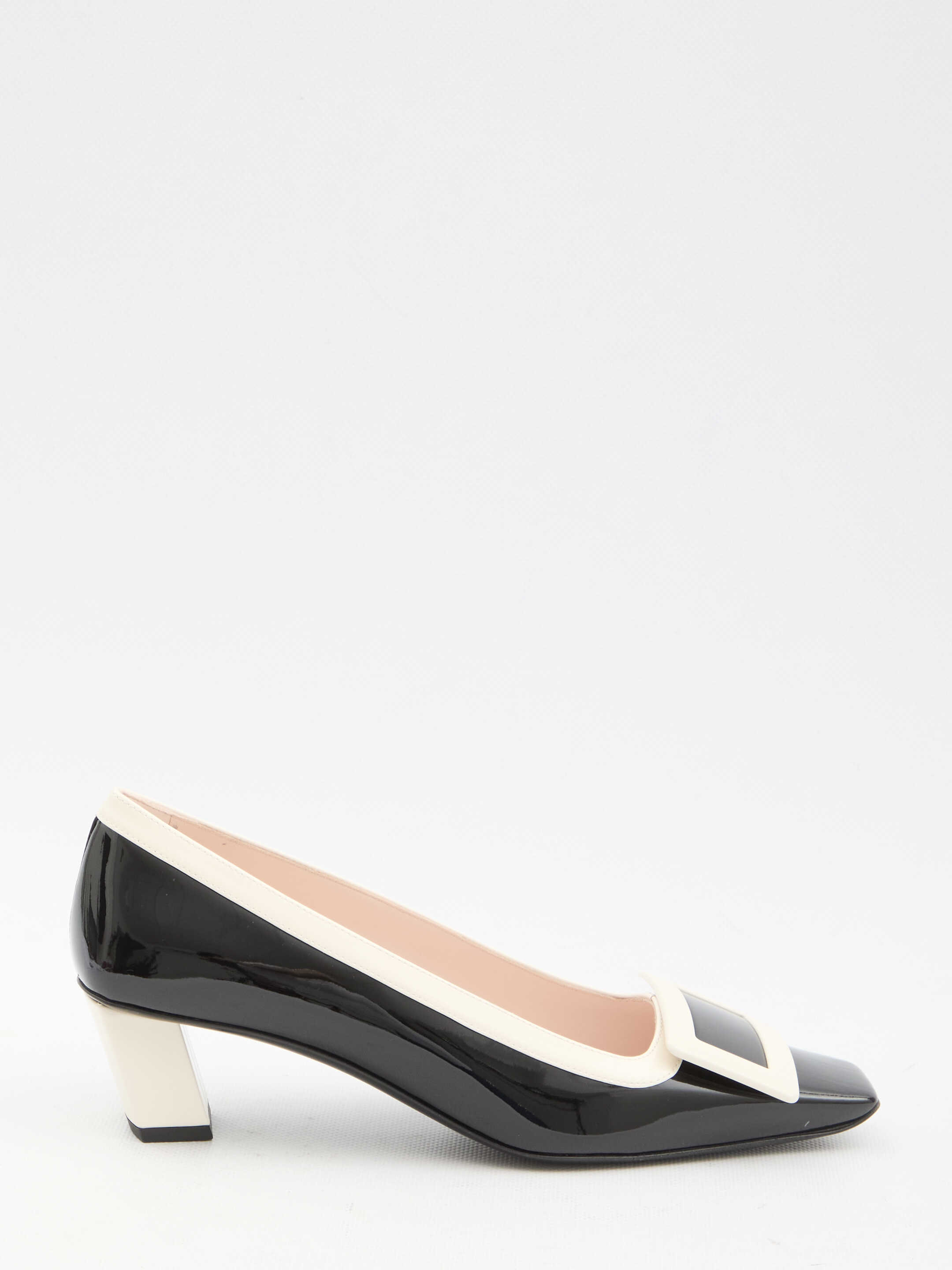 Belle Vivier pumps in black and white patent leather with covered buckle. They feature square toe, Skyscraper heel and leather sole. Any leather imperfections are not to be considered manufacturing defects, but a peculiarity of the material.