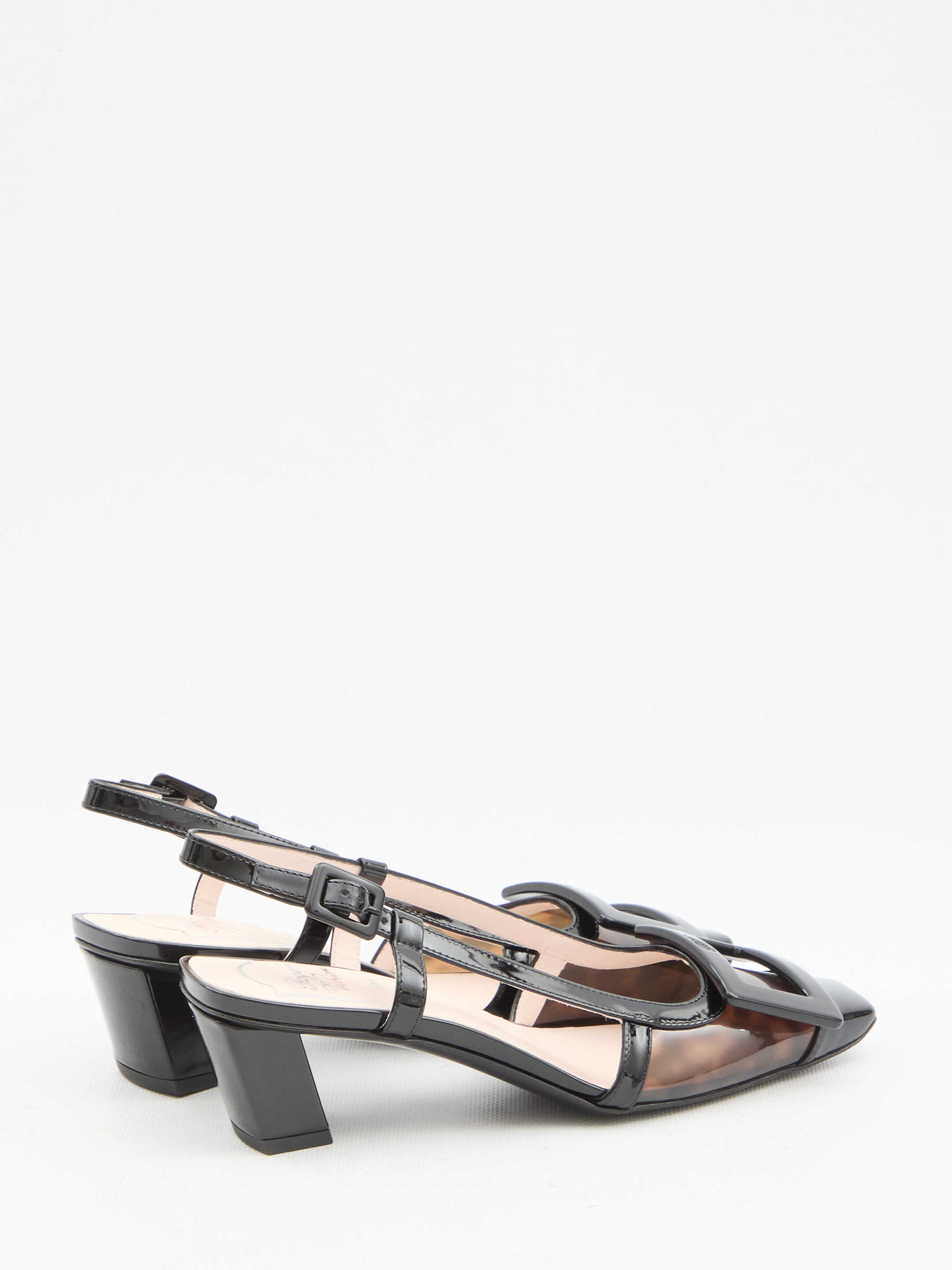 Belle Vivier slingback pumps in black patent leather with tortoiseshell PVC inserts. They feature square toe, lacquered buckle, adjustable ankle strap, Skyscraper heel and leather sole. Any leather imperfections are not to be considered manufacturing defects, but a peculiarity of the material.