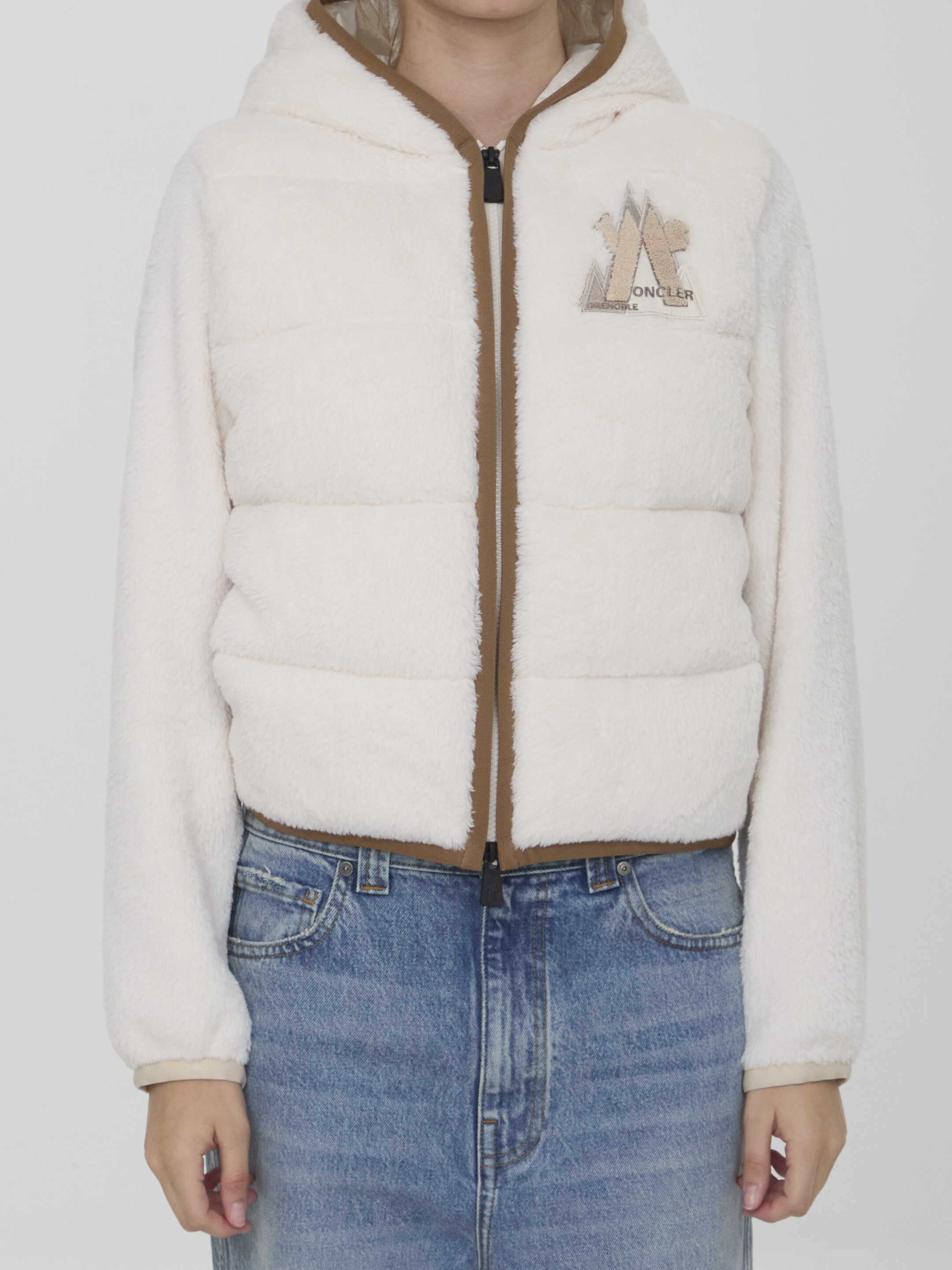 Cream-colored teddy hoodie with beige fabric trims. It features hood, front two-way zip closure, two side welt pockets, elasticated cuffs and embossed logo patch on chest. Regular fit.