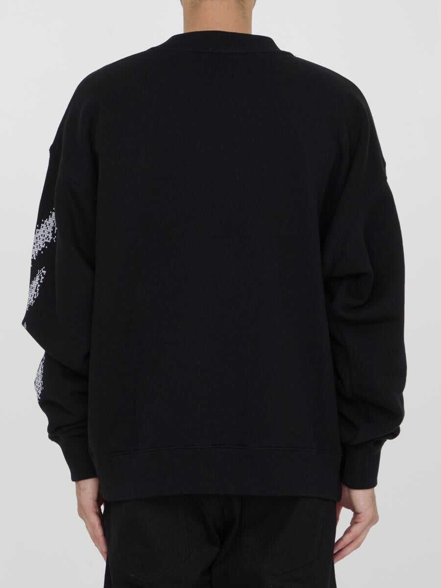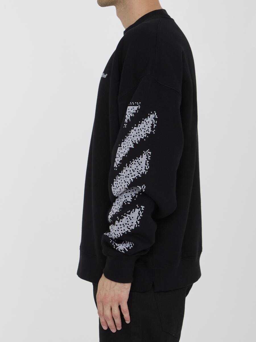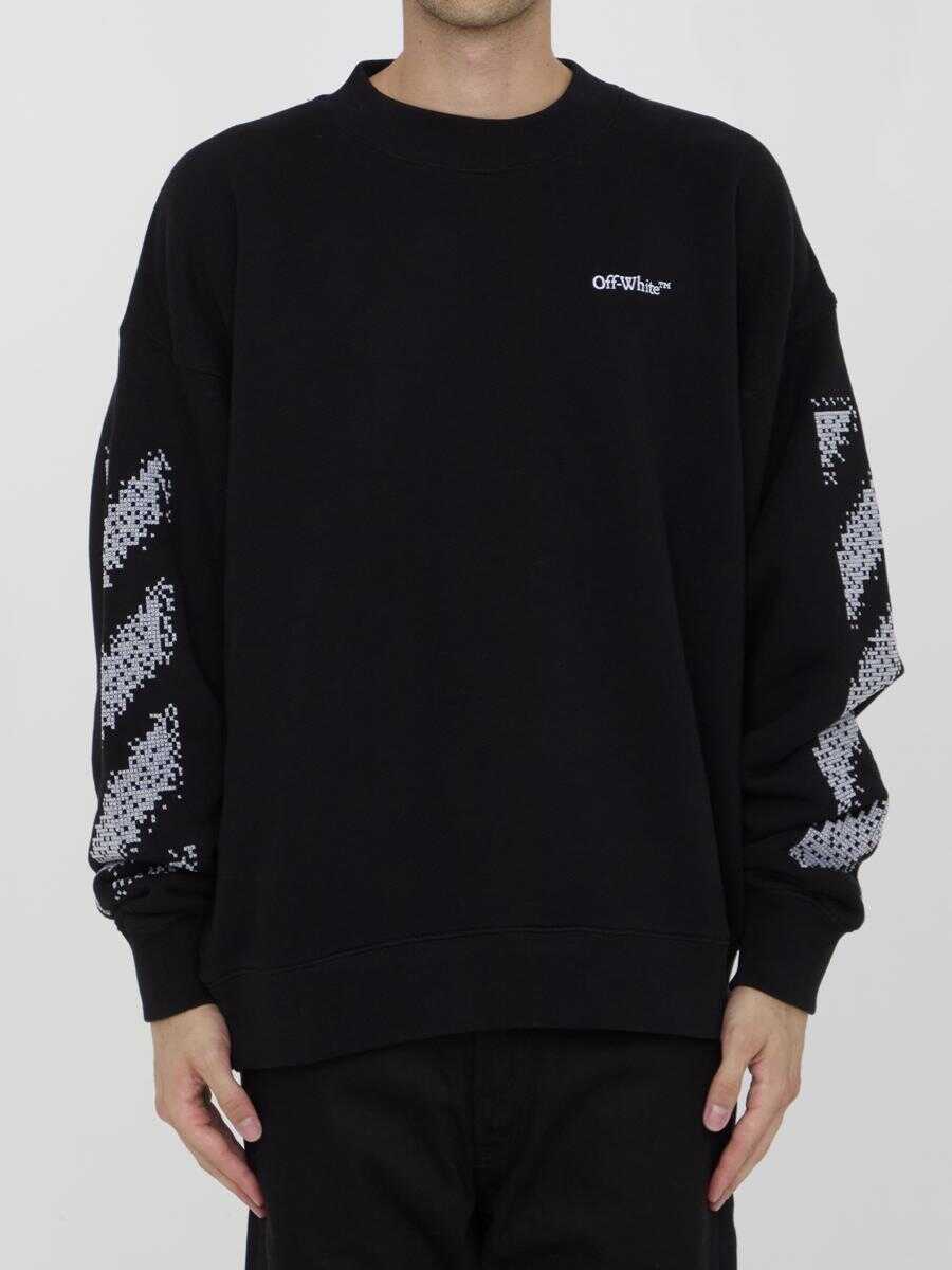 Long-sleeved crewneck sweatshirt in black cotton with Off-White logo embroidered on chest and Pixel Diag motif embroidered on sleeves. Ribbed collar, cuffs and hem. Skate fit.