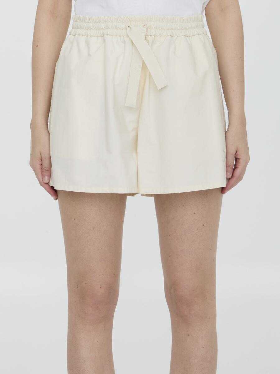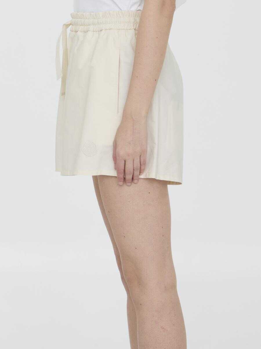 White cotton shorts. It features stretch waistband with drawstring, two side welt pockets and logo patch on left leg. Regular fit.