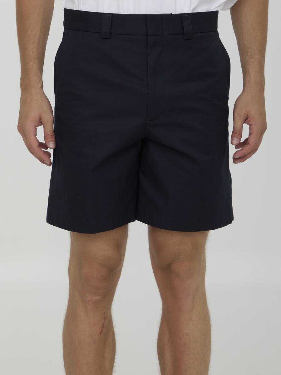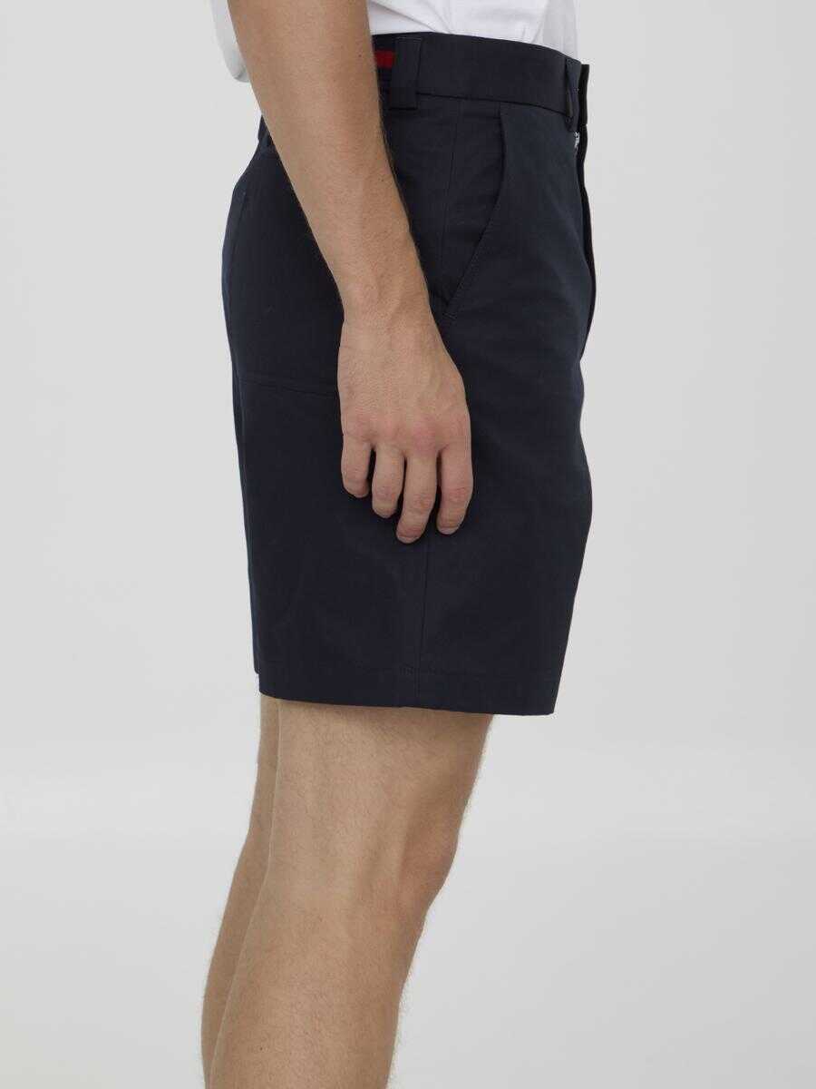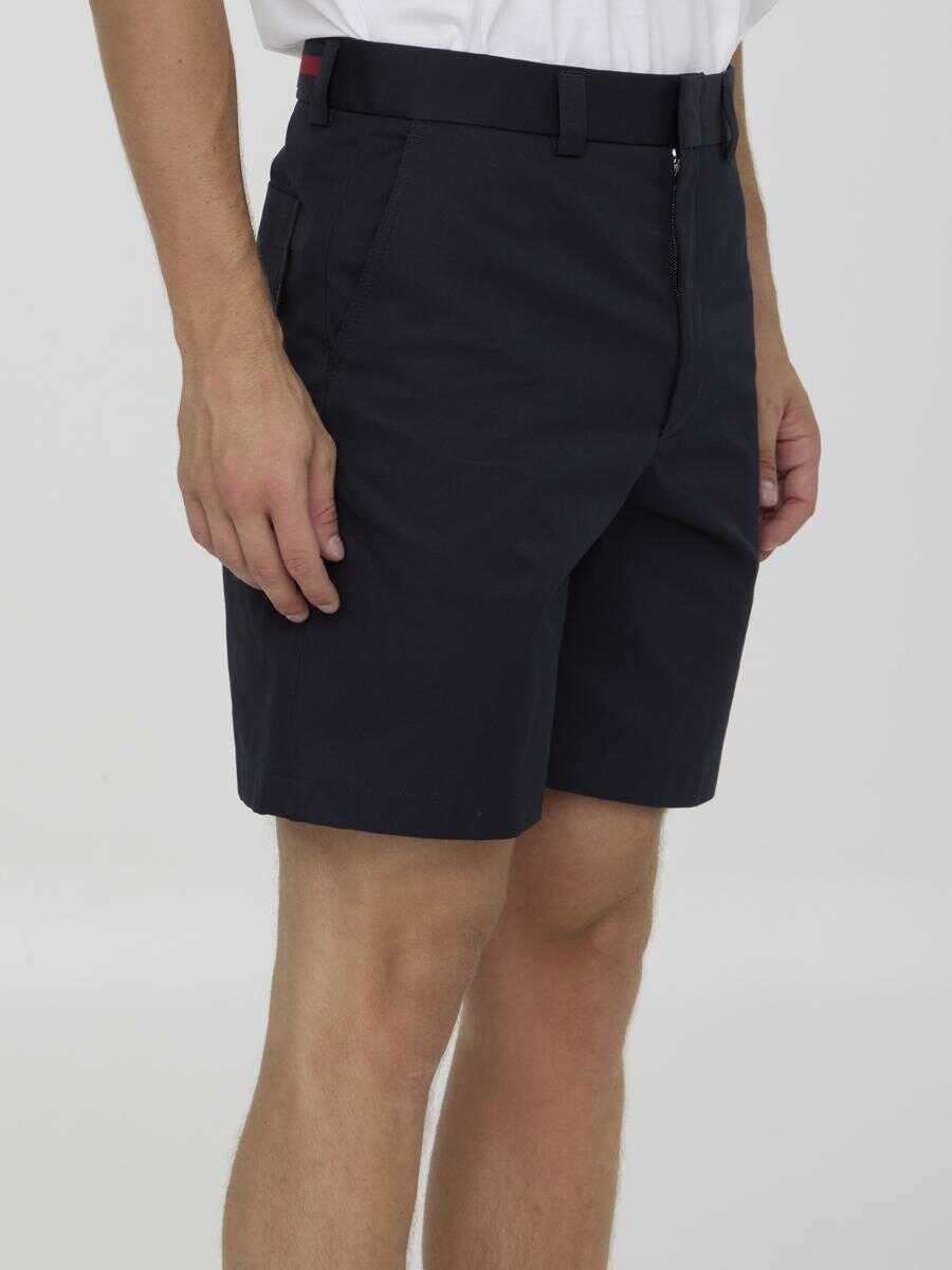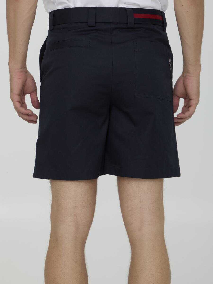 Bermuda shorts in dark blue double cotton twill with blue and red Web detail. It features zip and hook closure, two side welt pockets, one rear welt pocket, one rear patch pocket with Gucci label and belt loops. Regular fit.
