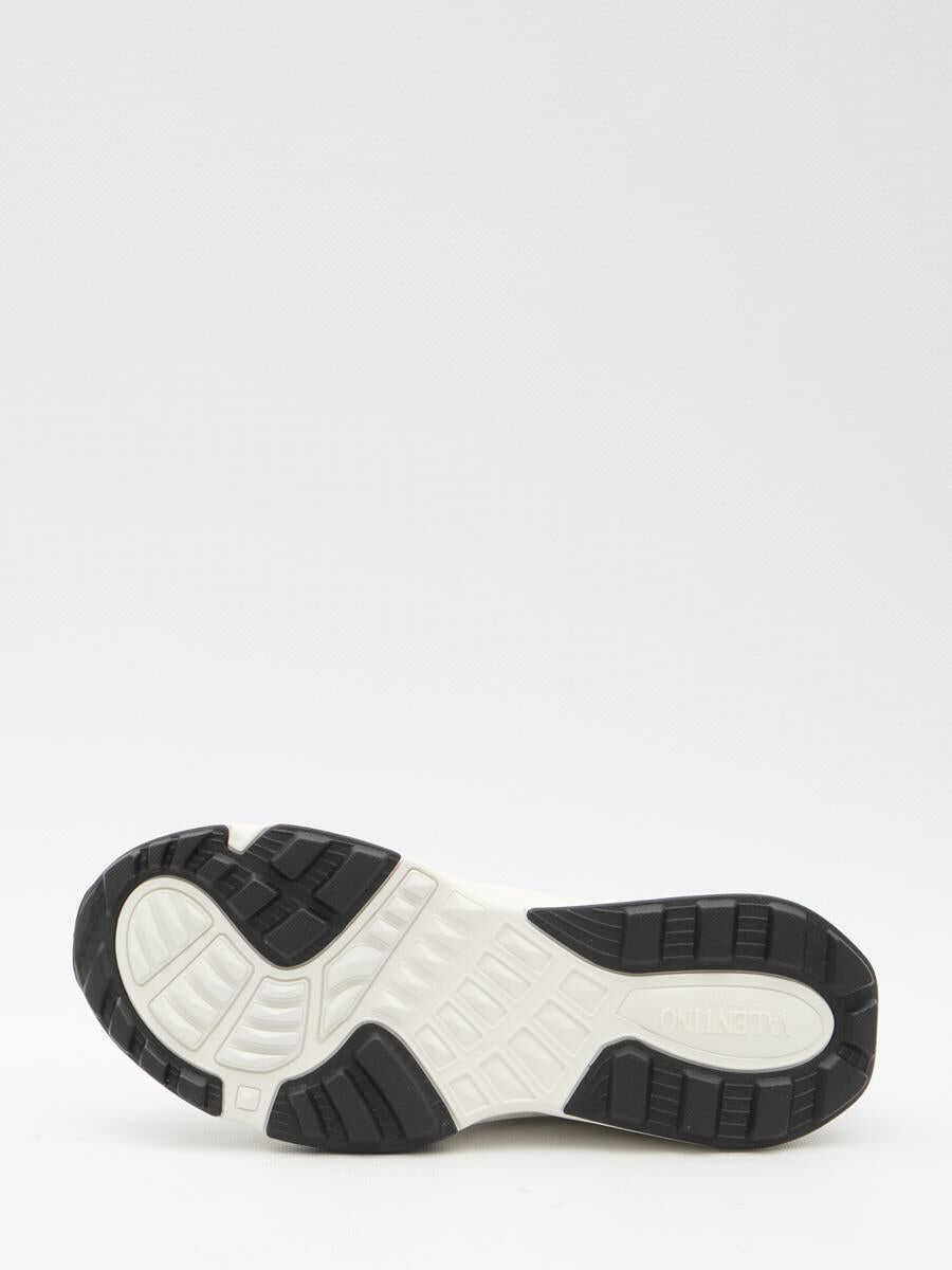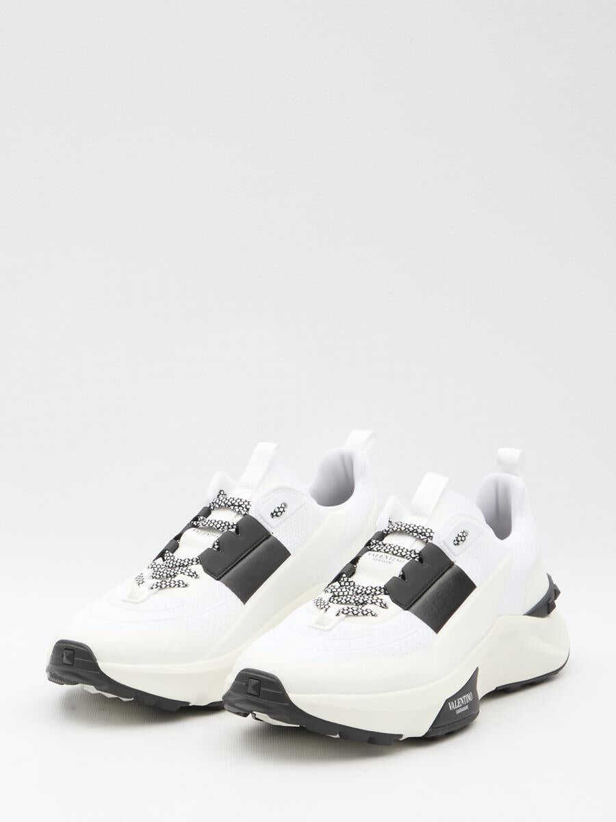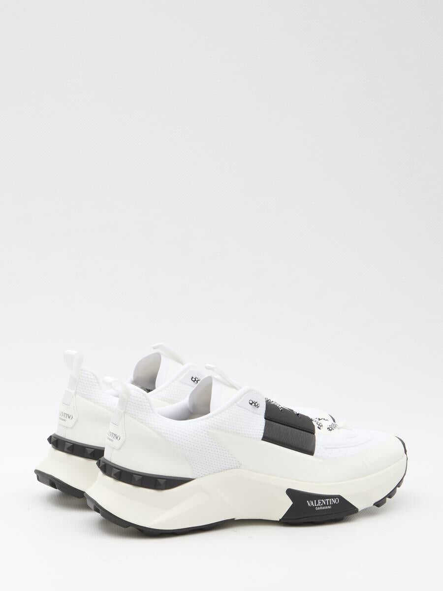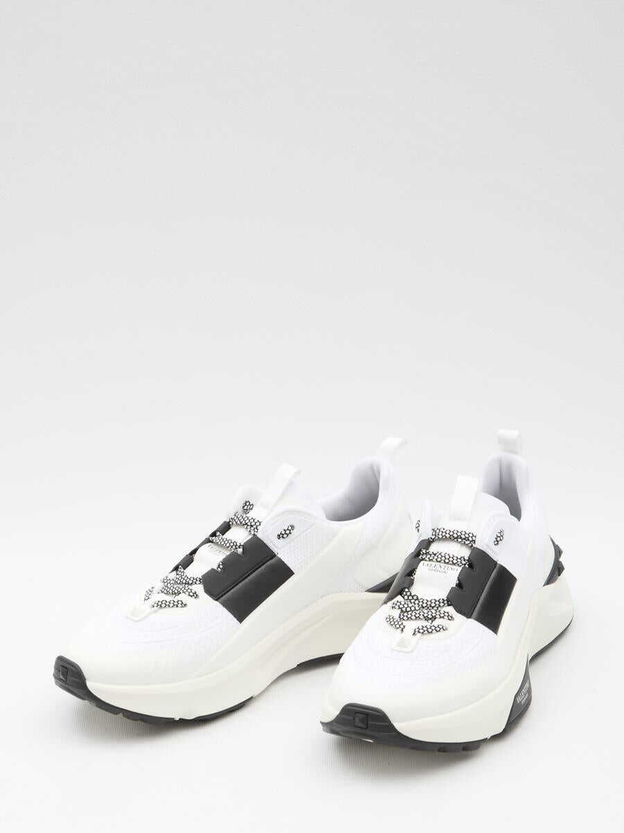 Valentino Garavani Low Top True Act sneakers in white and black mesh and rubber fabric. They feature lace-up closure, Valentino Garavani logo on tongue and rubber sole with studs detailing and Valentino Garavani logo printed on the side.