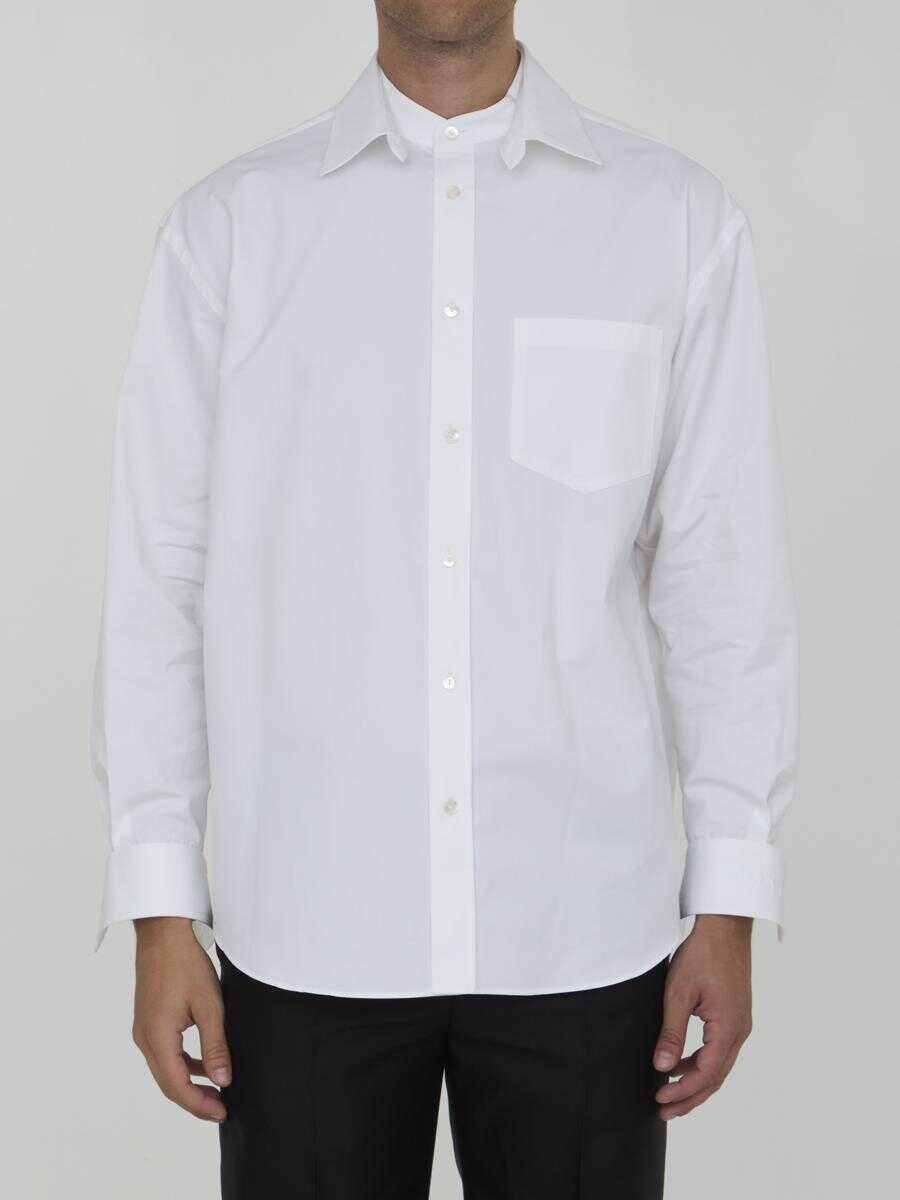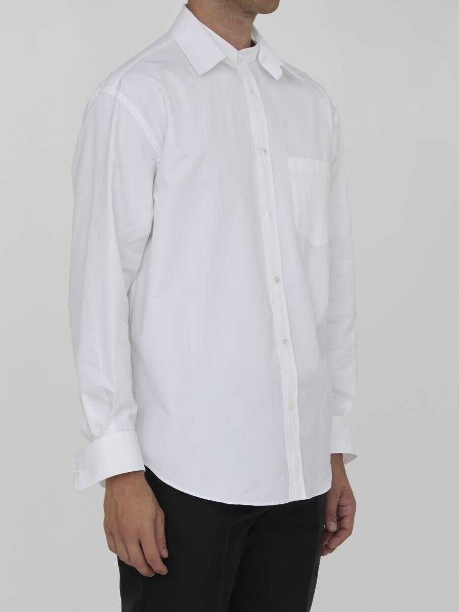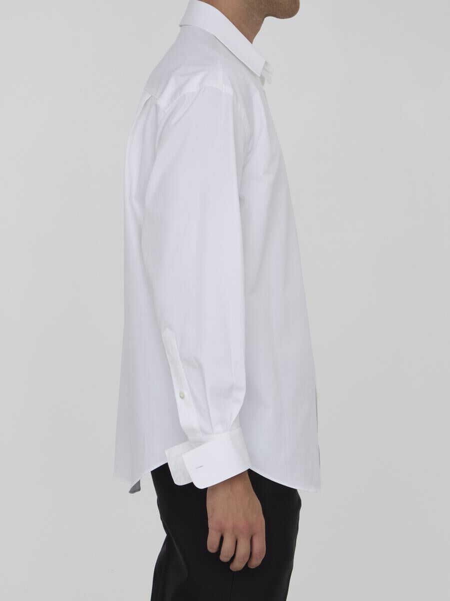 White cotton poplin shirt with embossed Gucci detail on left cuffs. It features double pointed and stand-up collar, front button closure, one patch pocket on chest and double cuffs. Regular fit.