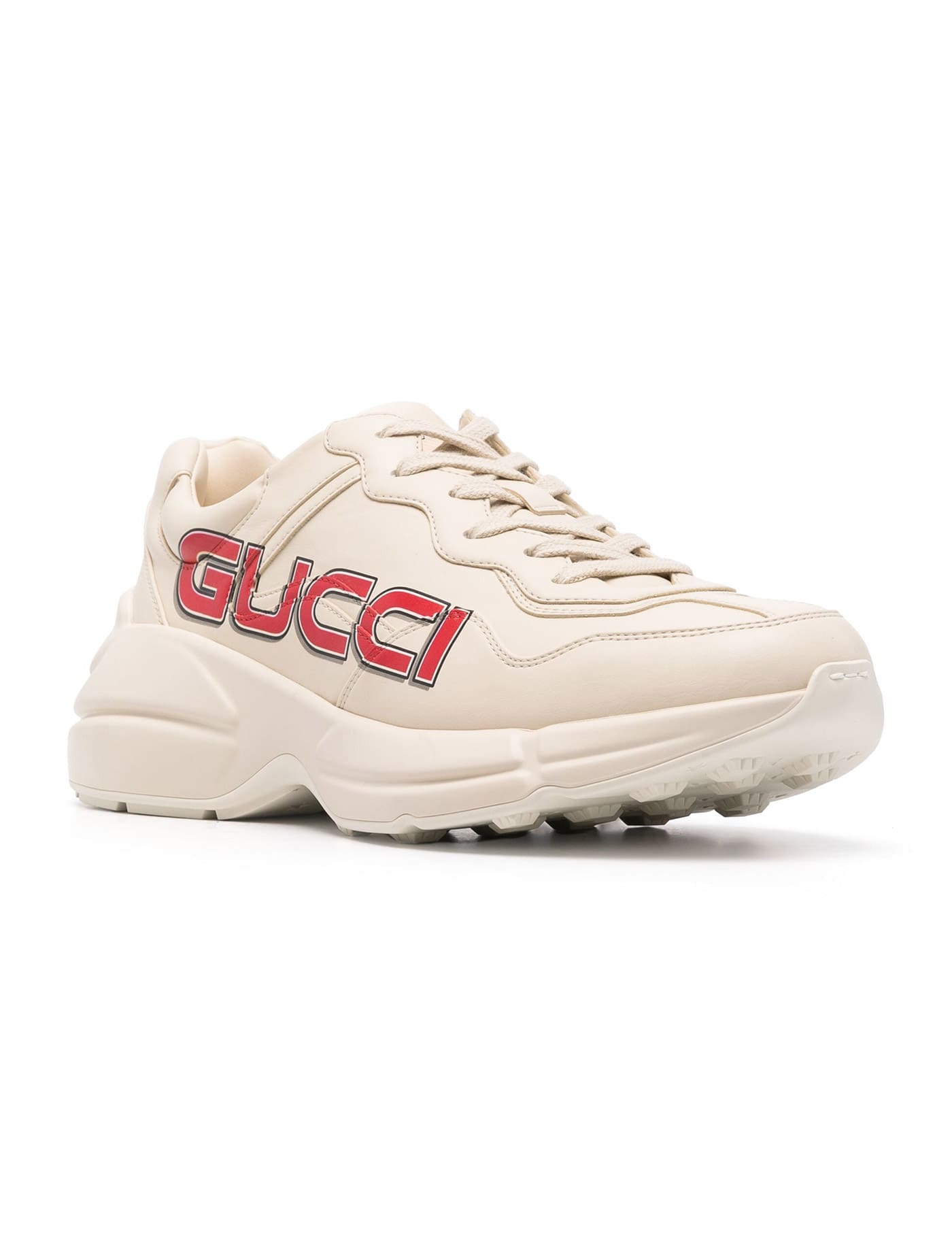 Rhyton sneakers in ivory Demetra leather with side Gucci print. They feature lace-up closure, Gucci logo label on tongue and rubber sole. Any leather imperfections are not to be considered manufacturing defects, but a peculiarity of the material.