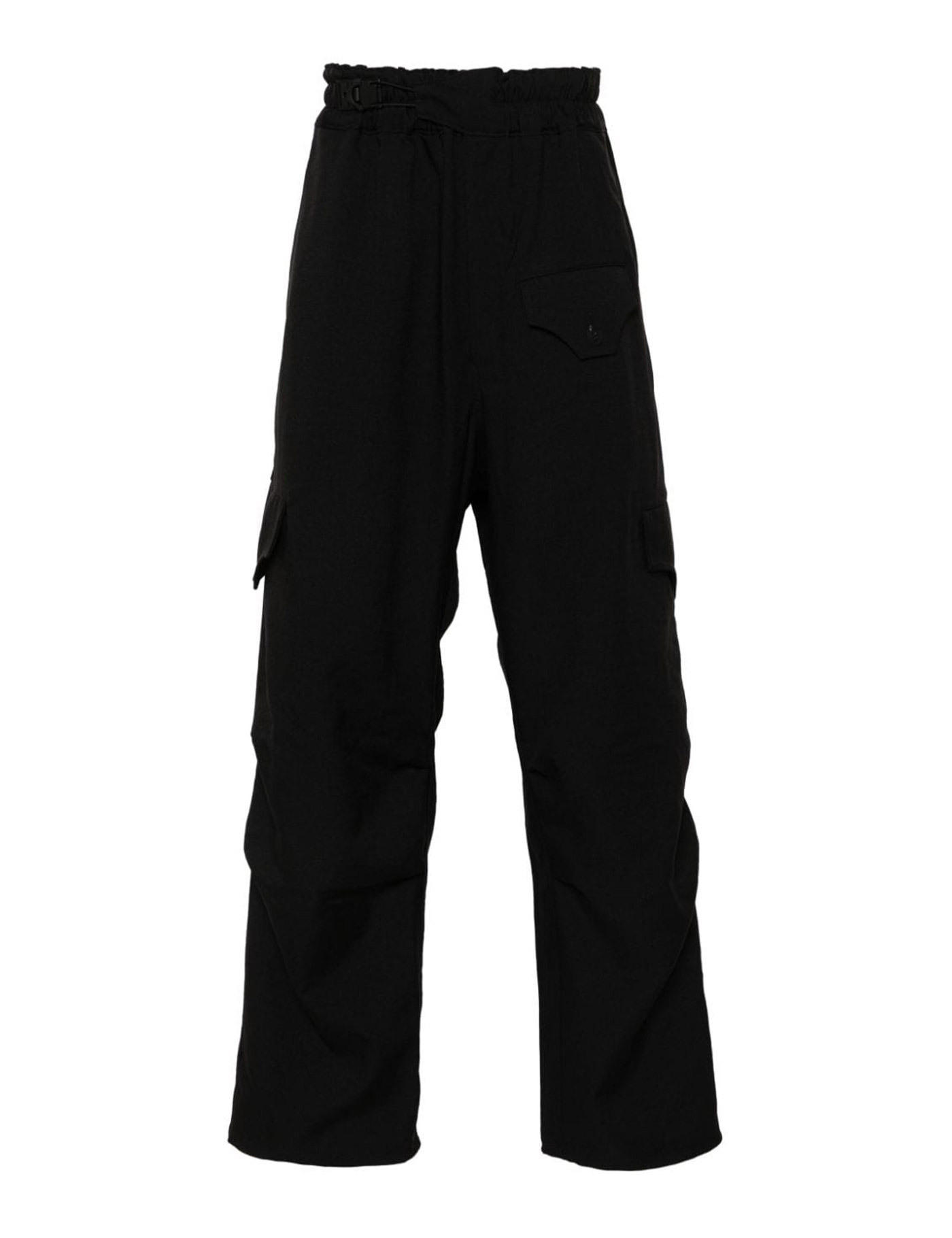 Pants in black polyester, drawstring, side pockets, cargo pockets, back pockets with zip, 100% polyester, Made in China