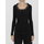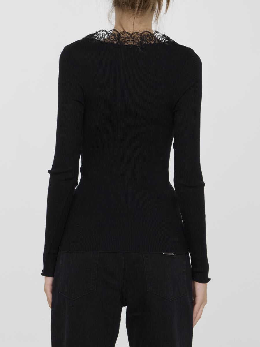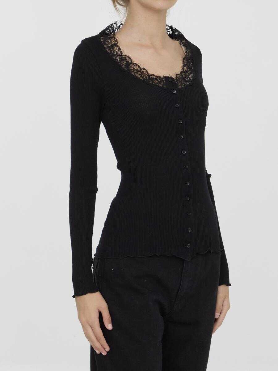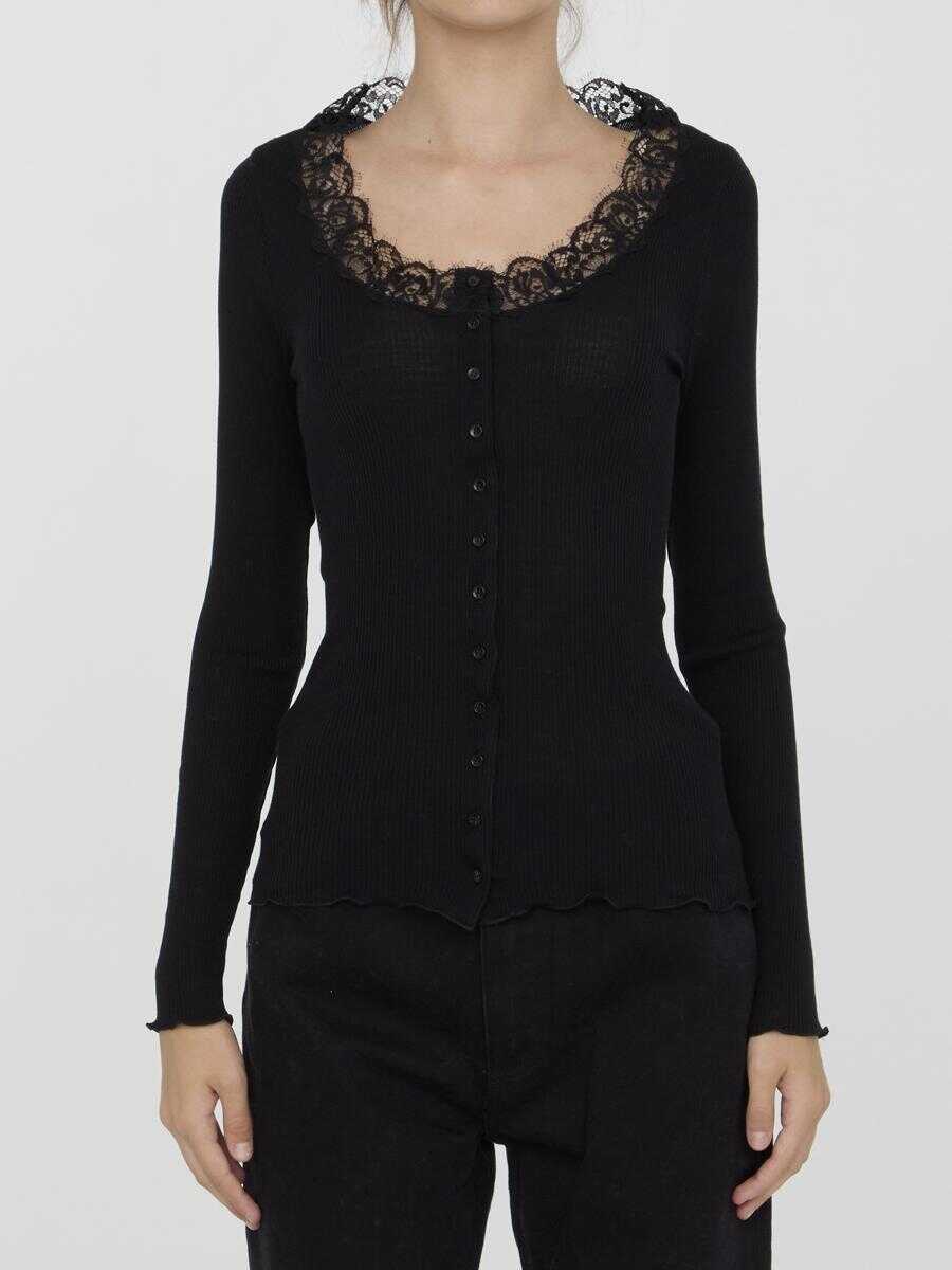 Long-sleeved cardigan with round neckline in black wool and silk with tone-on-tone lace insert. It features front button closure and cuffs and hem with ruches. Tight fit.