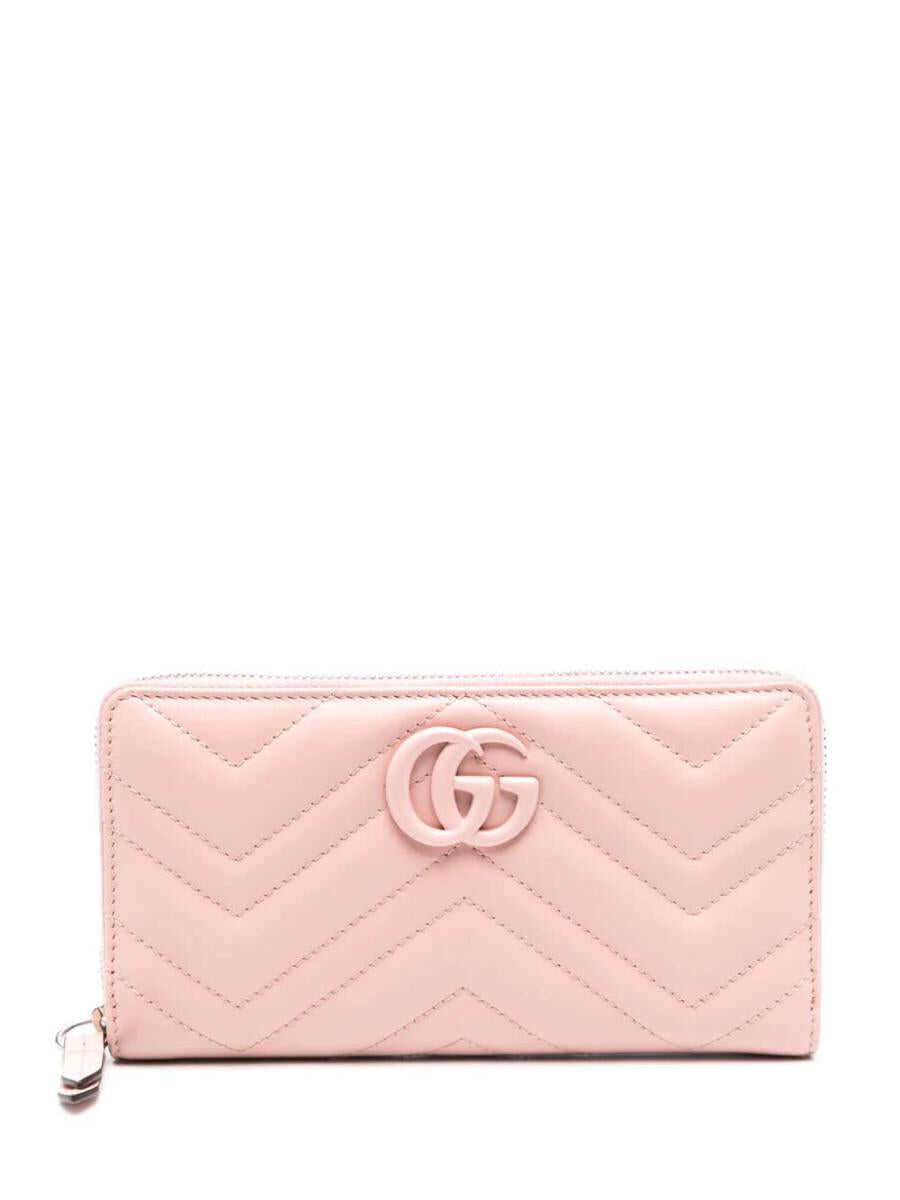 GG Marmont wallet in light pink, quilted-textured calfskin leather with the iconic Double G logo on the front. Practical and spacious, it features several interior compartments for organization.