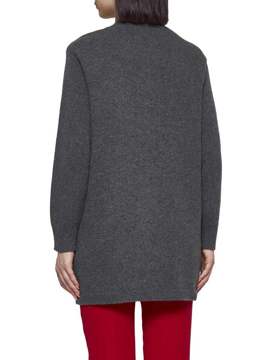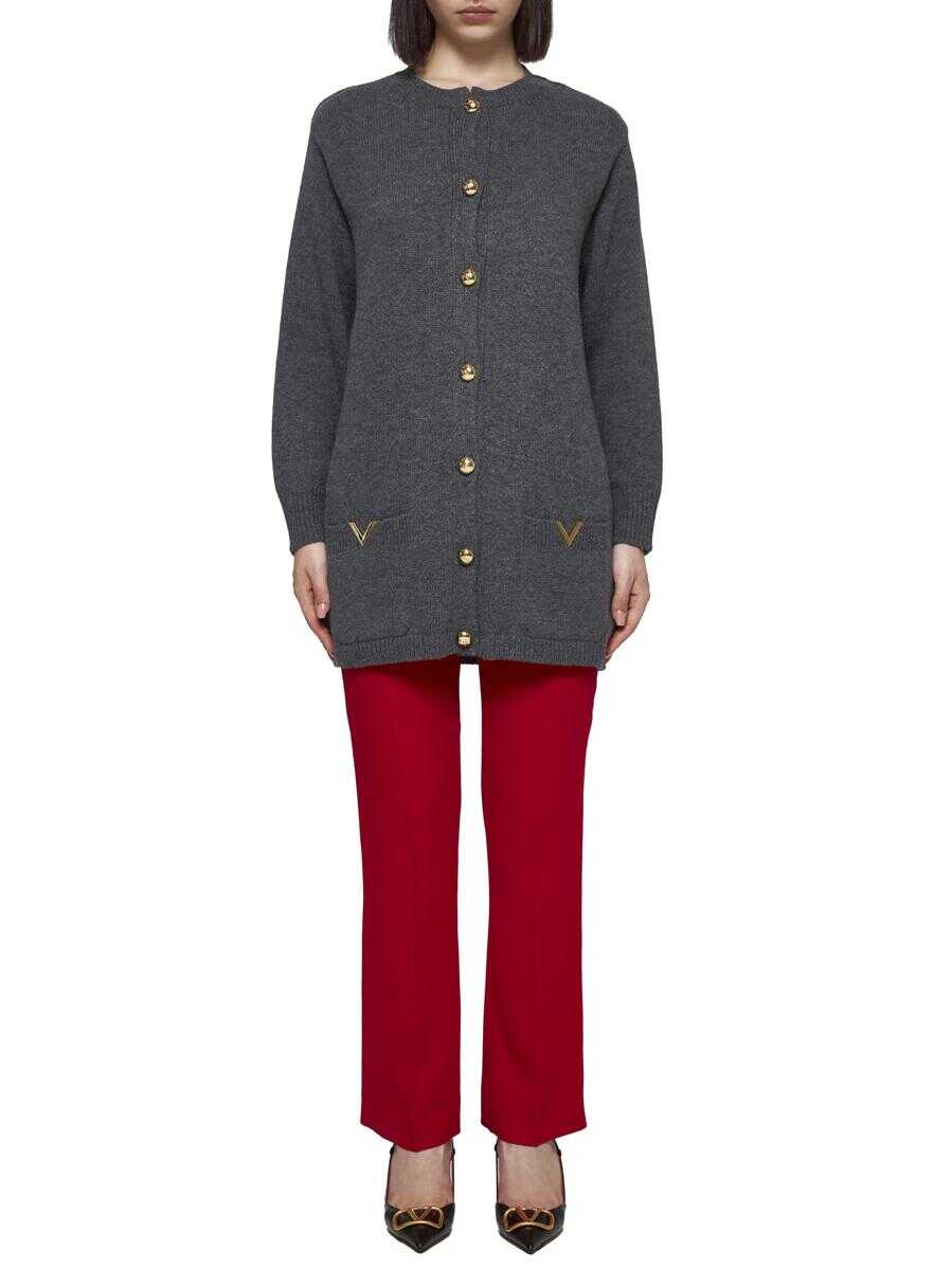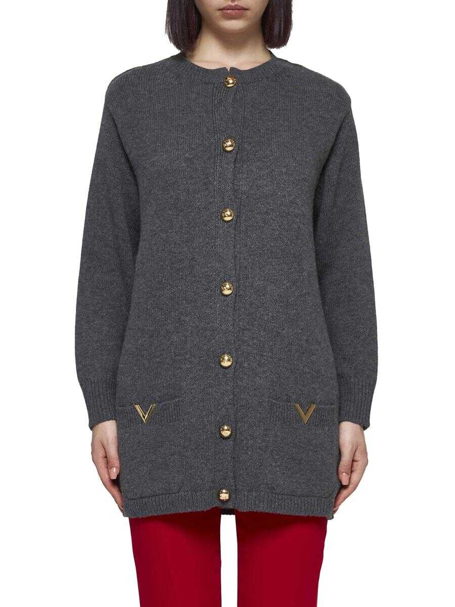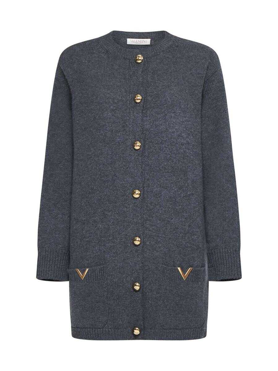 Valentino’s long cardigan in dark grey melange virgin wool featuring a crew neck, gold-tone metal buttons, front pockets with gold-tone metal V logo plaque, ribbed edges and straight hem. The model is wearing shoes and accessories from Valentino Garavani. Size Type: International