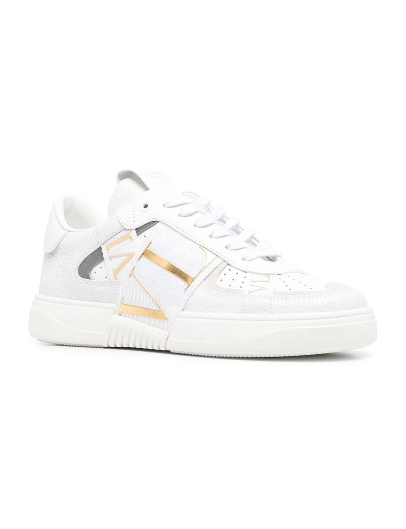 white gold-tone calf leather round toe logo-print strap logo patch at the tongue front lace-up fastening flat rubber sole HEEL: 3.5 Centimetres