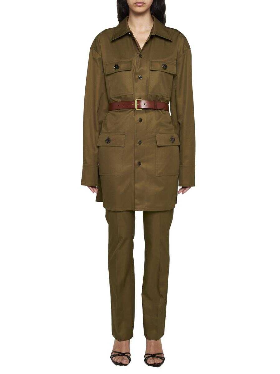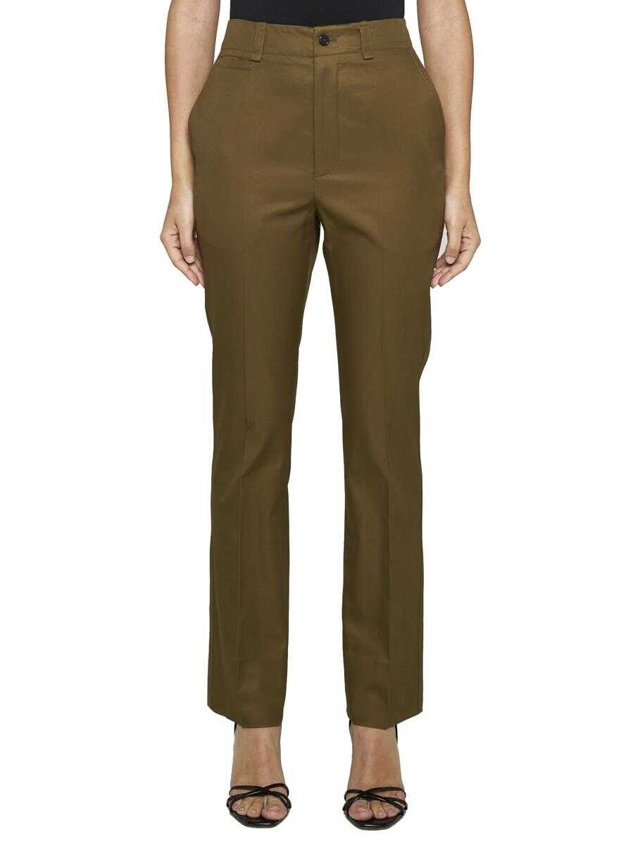 Saint Laurent’s brown cotton trousers featuring medium waist, belt loops, button and zip fastening, side pockets, rear welt pockets and straight leg with ironed crease.