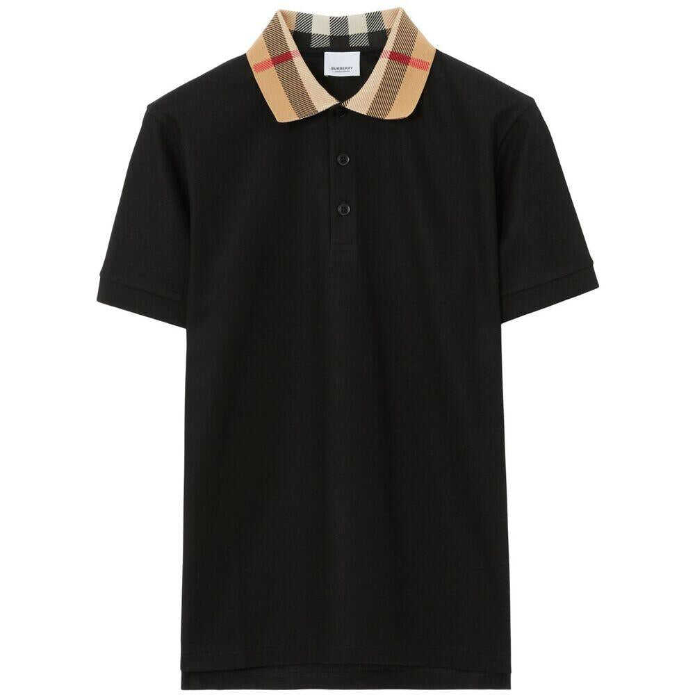 Black cotton check print contrasting polo collar front button placket short sleeves straight hem