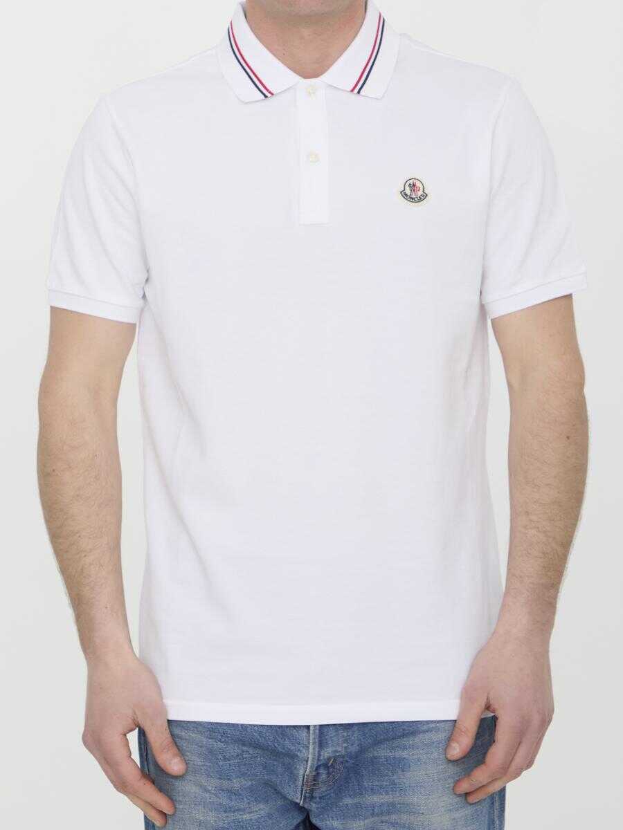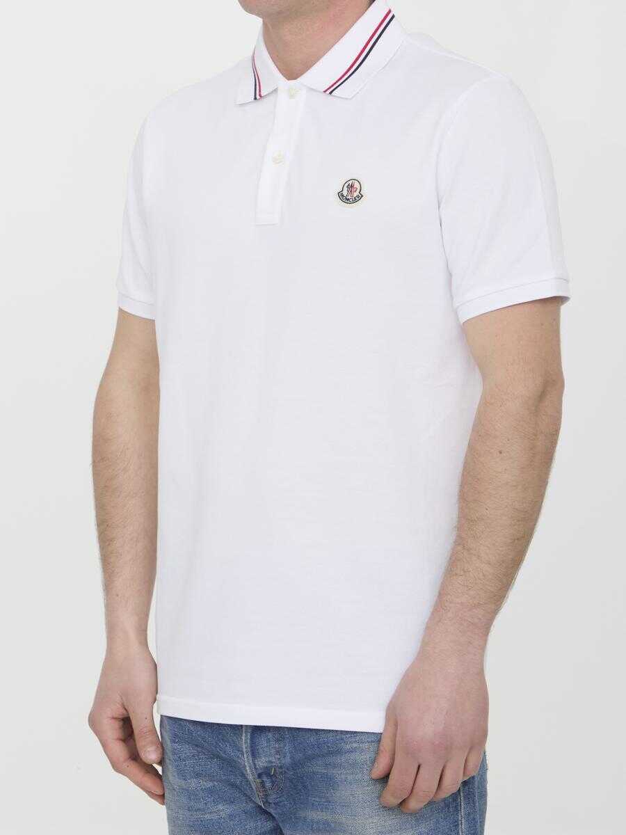 Short-sleeved polo shirt in white piquet cotton. It features classic collar with tricolor trims, front buttoned placket, logo patch on chest and Moncler logo printed at the back of the neck. Ribbed trims. Regular fit.