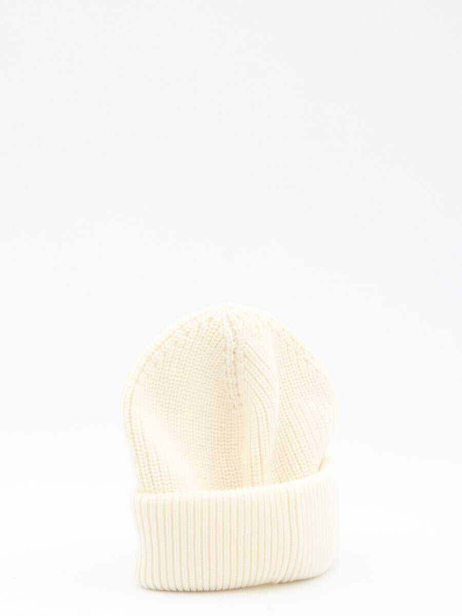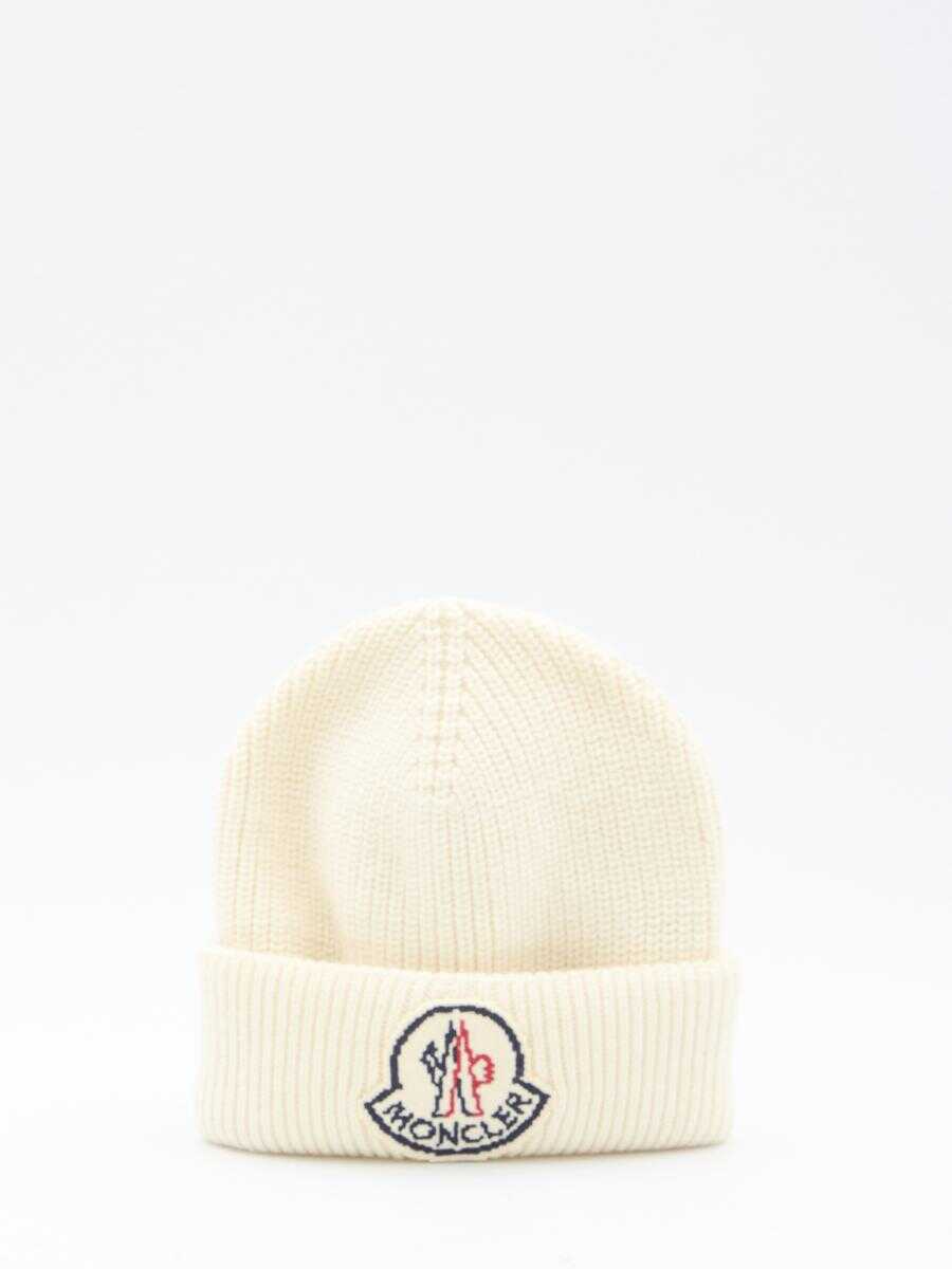 Beanie in ivory tricot virgin wool. It features Moncler patch on the front and cuffed hem.
