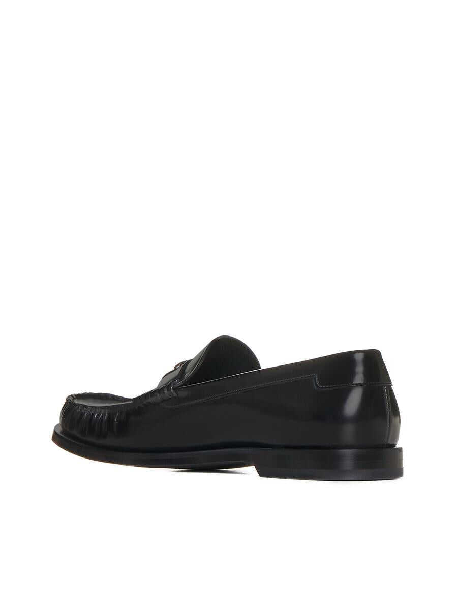 Dolce & Gabbana’s black leather loafers featuring a gathered rounded toe, silver-tone metal DG logo plaque on the strap and leather sole.