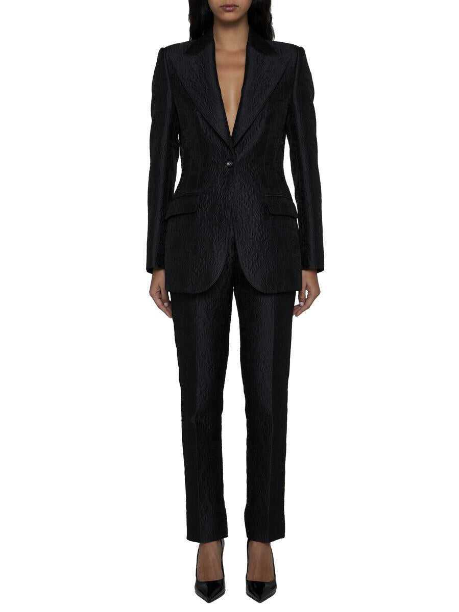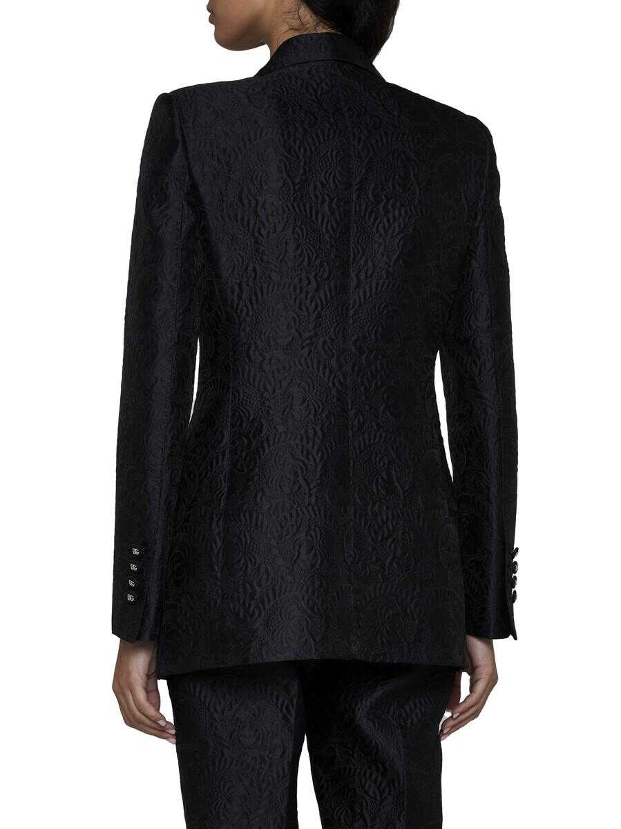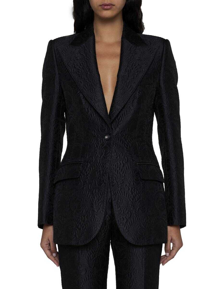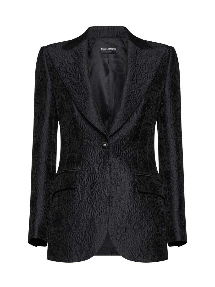 Dolce & Gabbana’s single-breasted blazer in black floral brocade cotton and silk blend featuring peak lapels, buttons with DG logo, chest pocket, front flap pockets and back vents.