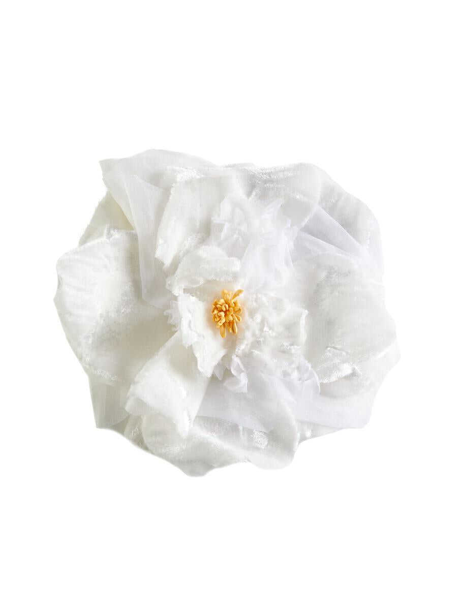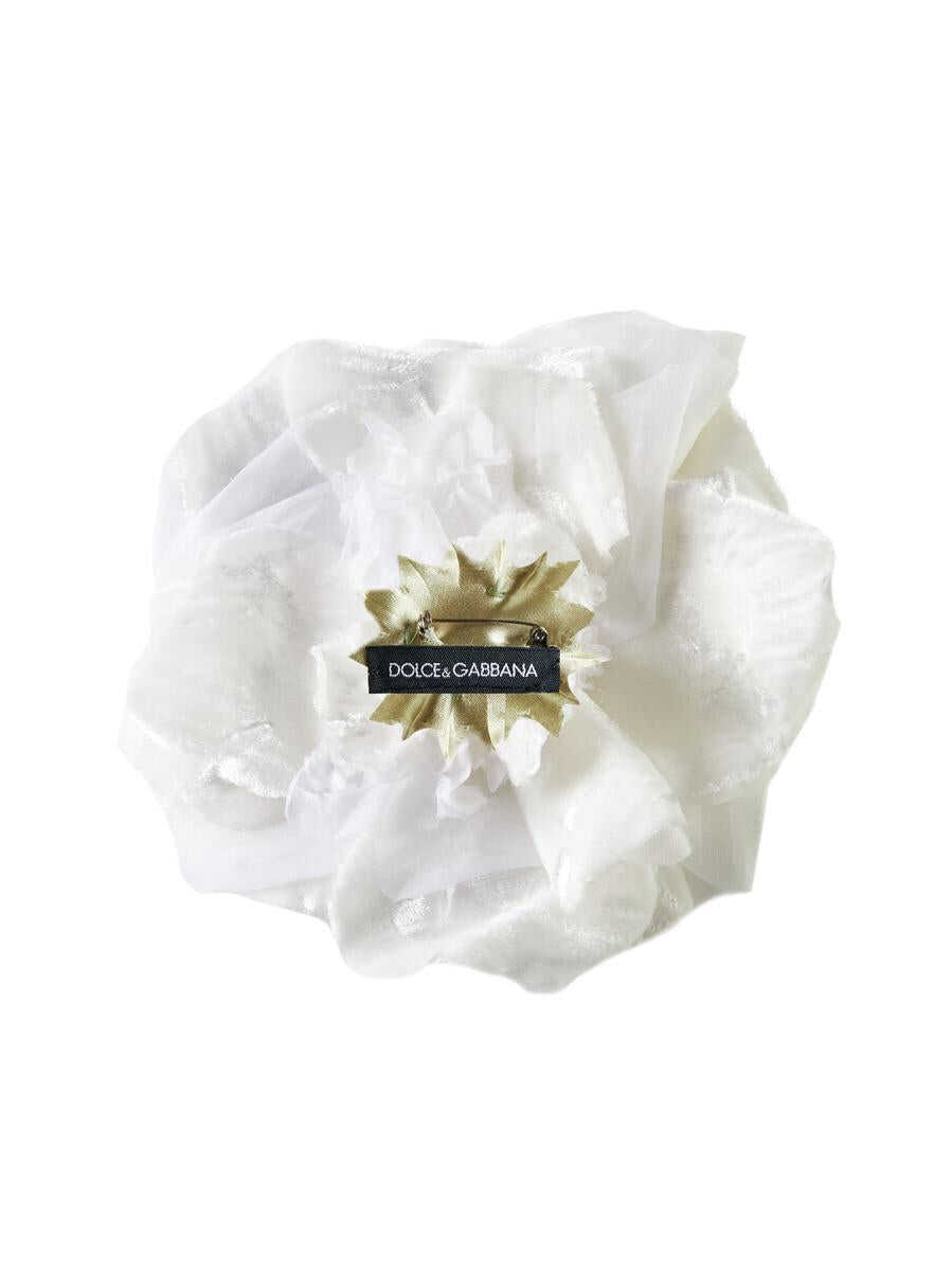 Dolce & Gabbana's brooch featuring a white silk flower and logo label on the back.